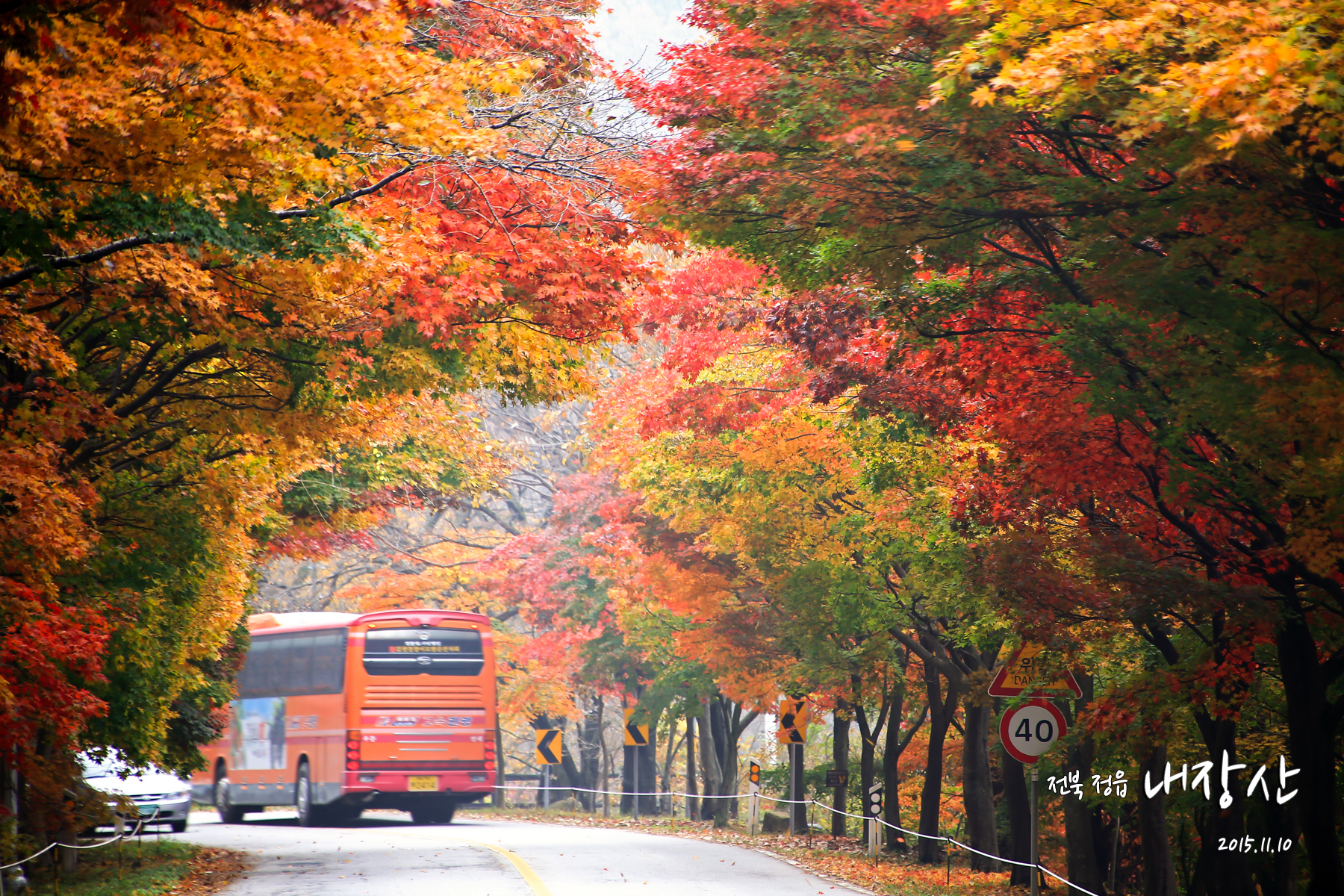 내장사로 향하는 셔틀버스 주차장에서 보이는 단풍길.. 내장산은 원래 산 자체의 단풍보다는 주차장에서 내장사에 이르는 단풍 터널을 으뜸으로 친다고 하니 산행 시간을 고려하여 하산할 때 걸어 보기로 한다.