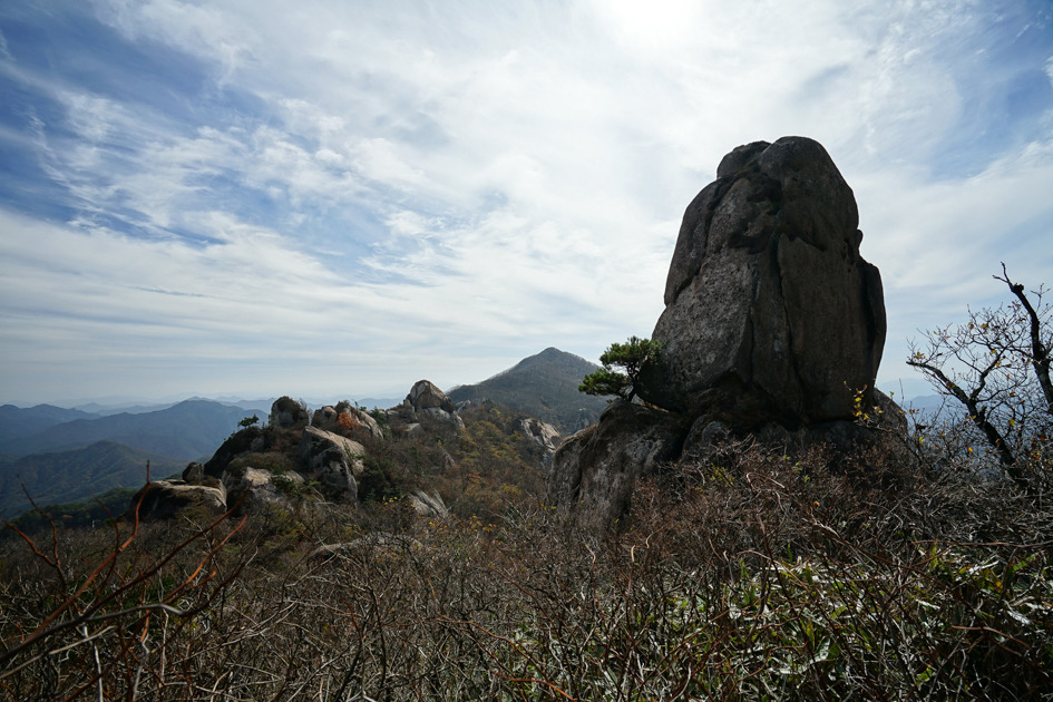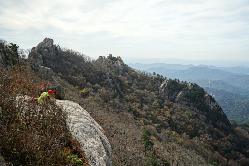 능선을 오르내리며 마주치는 갖가지 형상의 기암들도 무척 흥미롭다.