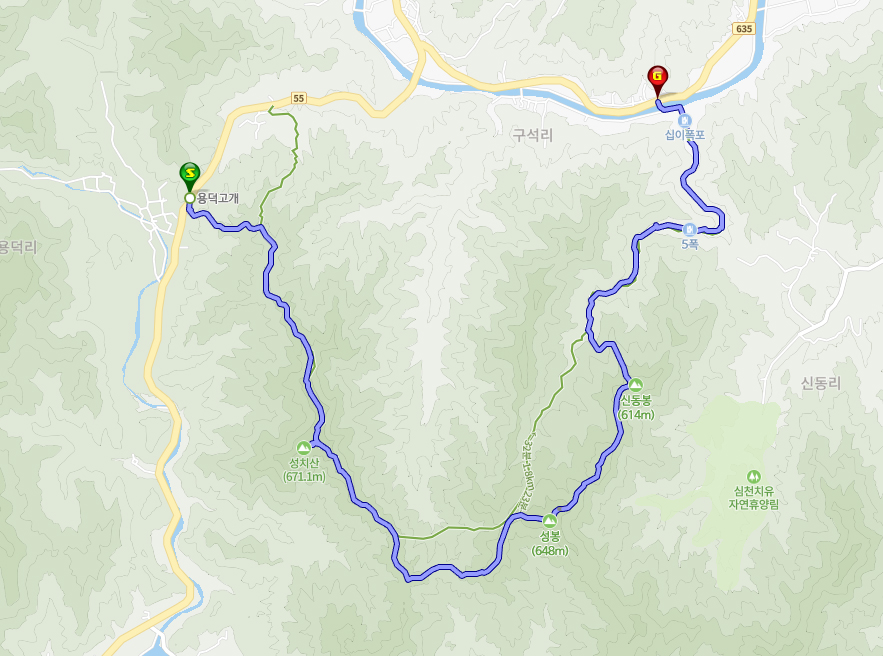△산행코스 : 용덕고개→성치산→성봉→신동봉→12폭포→구석리(모치마을)