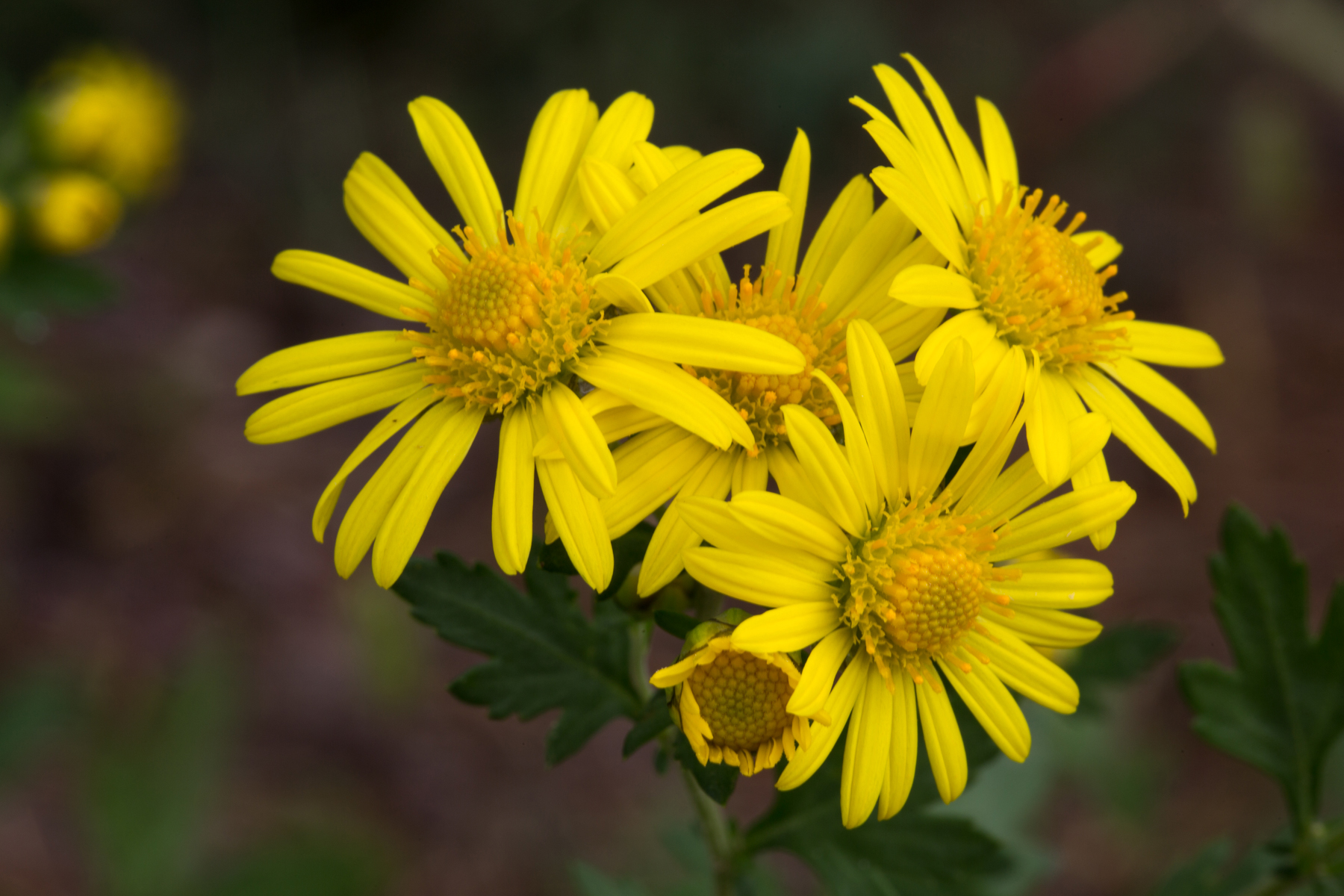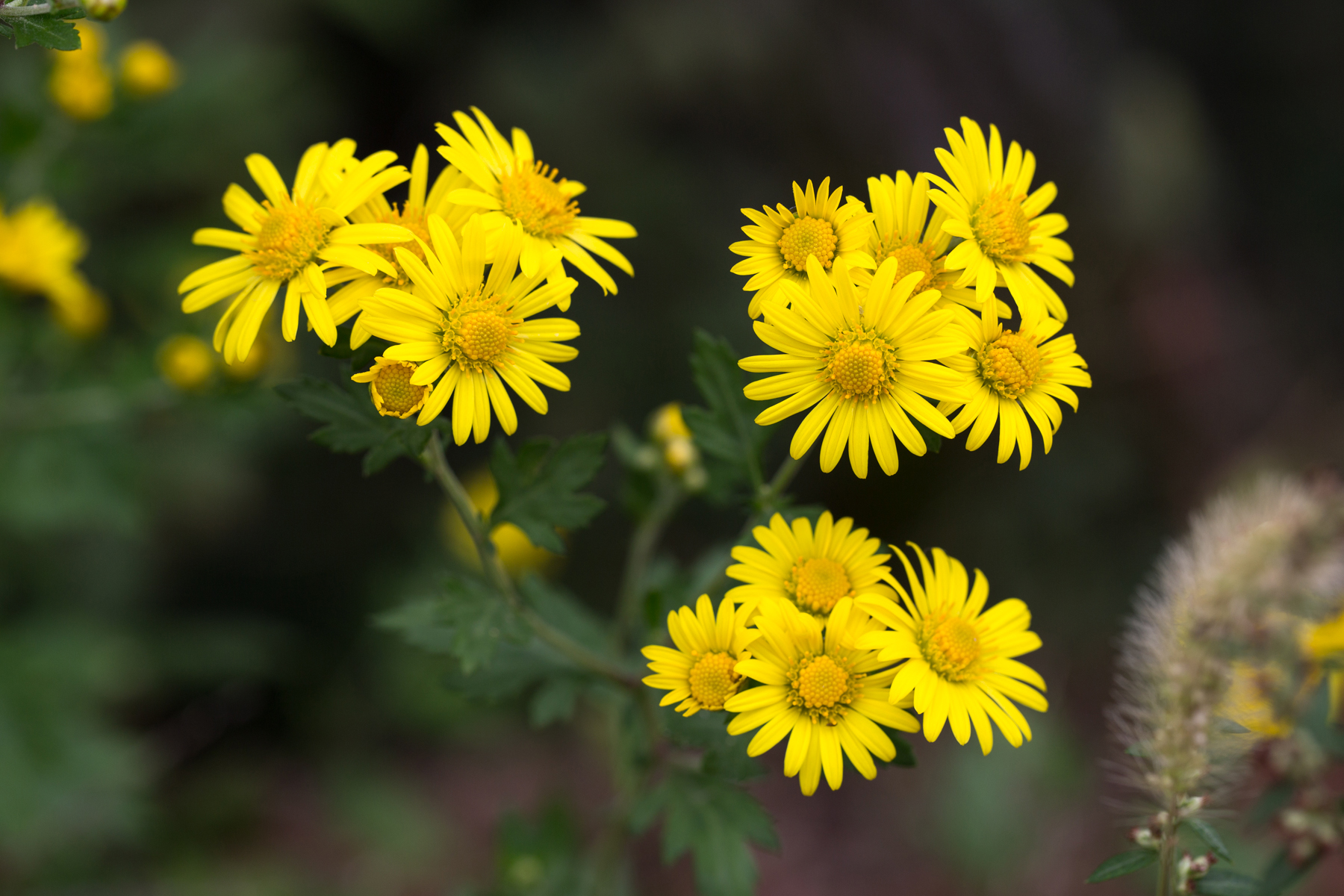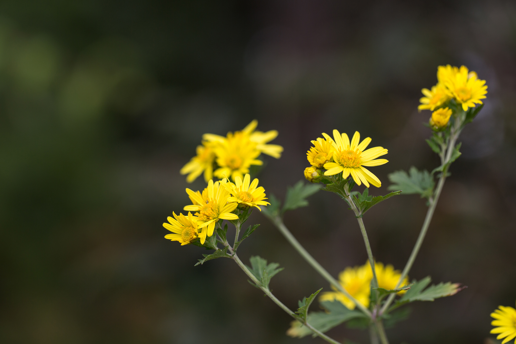 꽃은 9~11월에 노란색으로 피고 가지와 줄기 끝에 산방꽃차례로 달린다. 줄기는 모여나며 비스듬히 서고 보통 자흑색을 띠며 잔털이 있다. 잎은 어긋나고 계란형이며 깃꼴로 깊게 갈라진다.