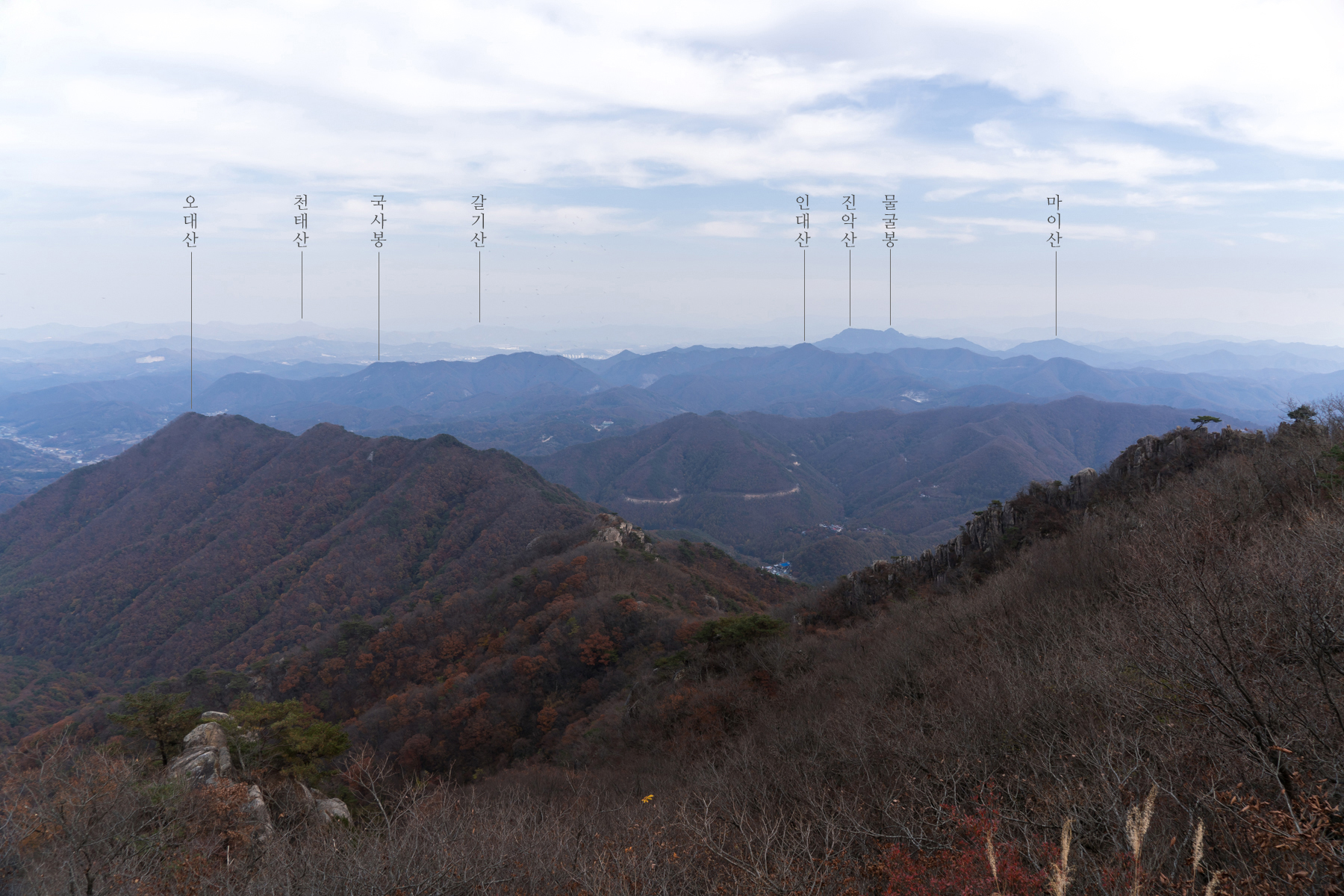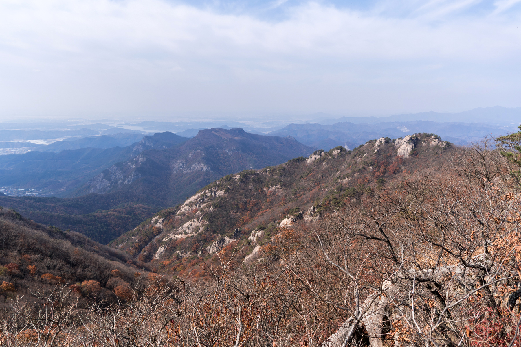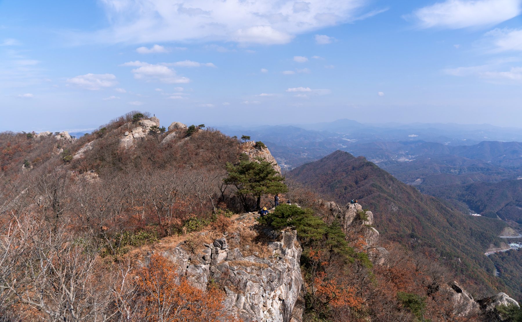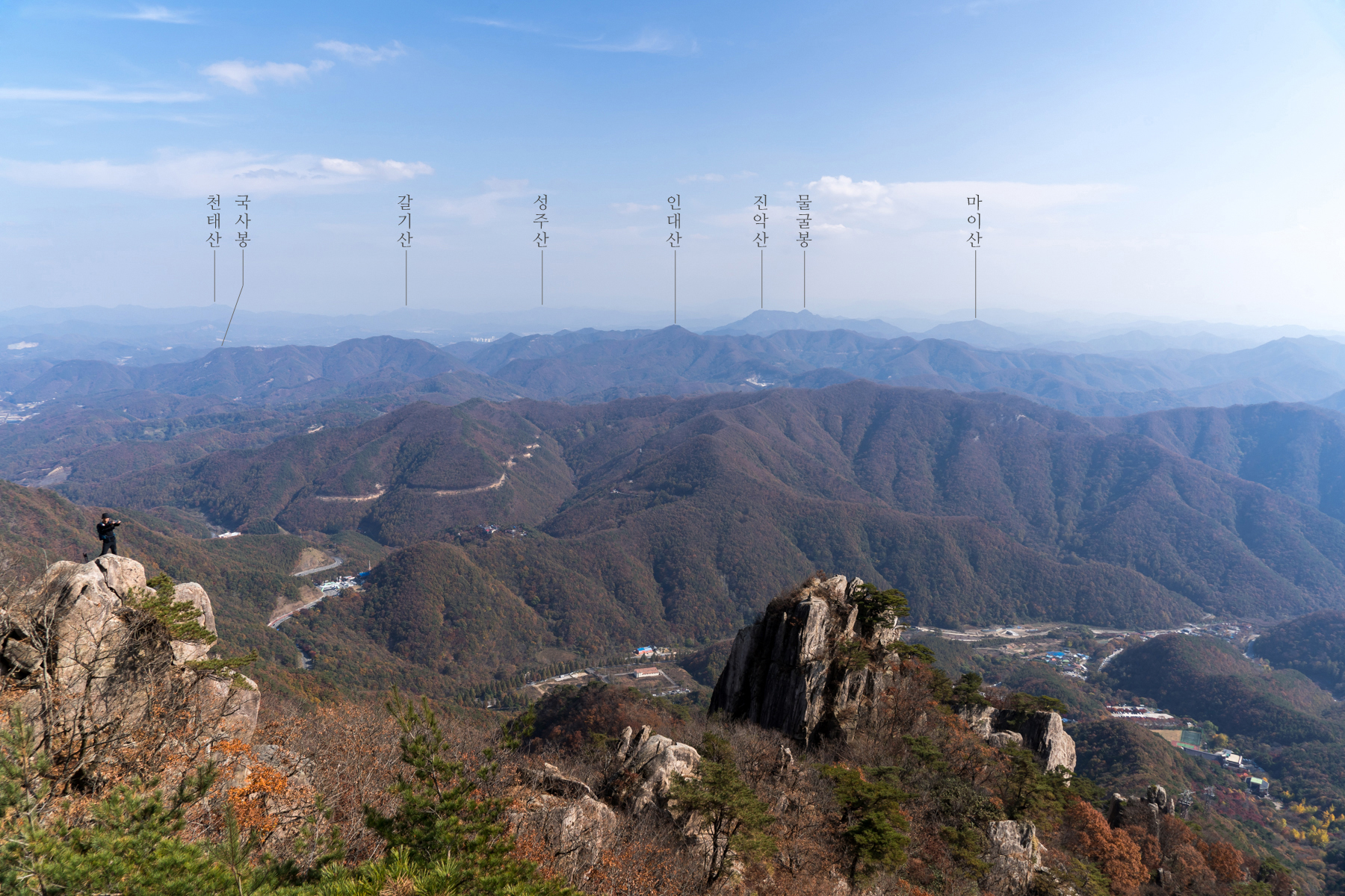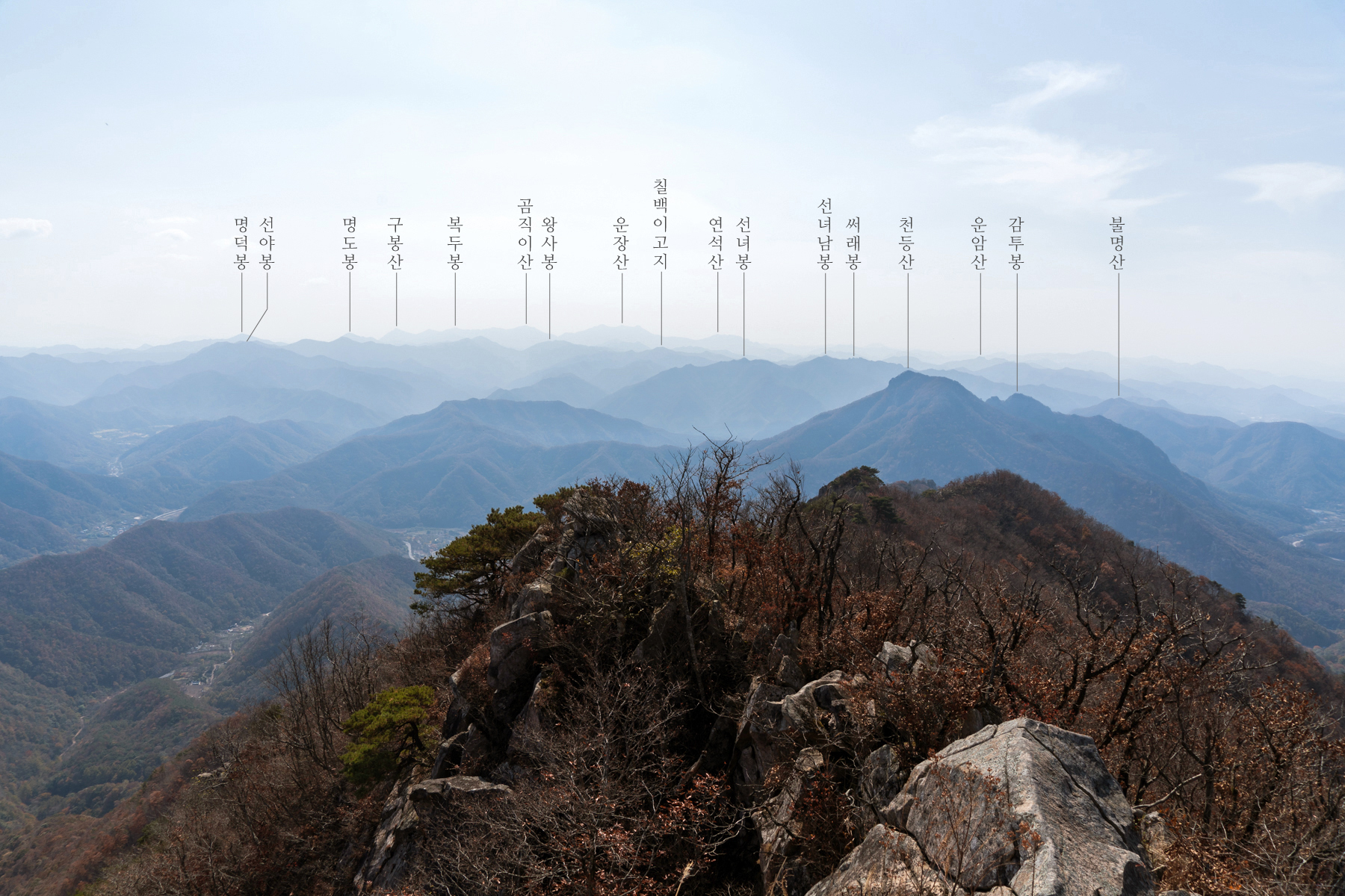 정상 표시석 없이 암석들만 늘어서 있는 서각봉에서 남쪽으로 시원하게 열린 조망이 아름답다.