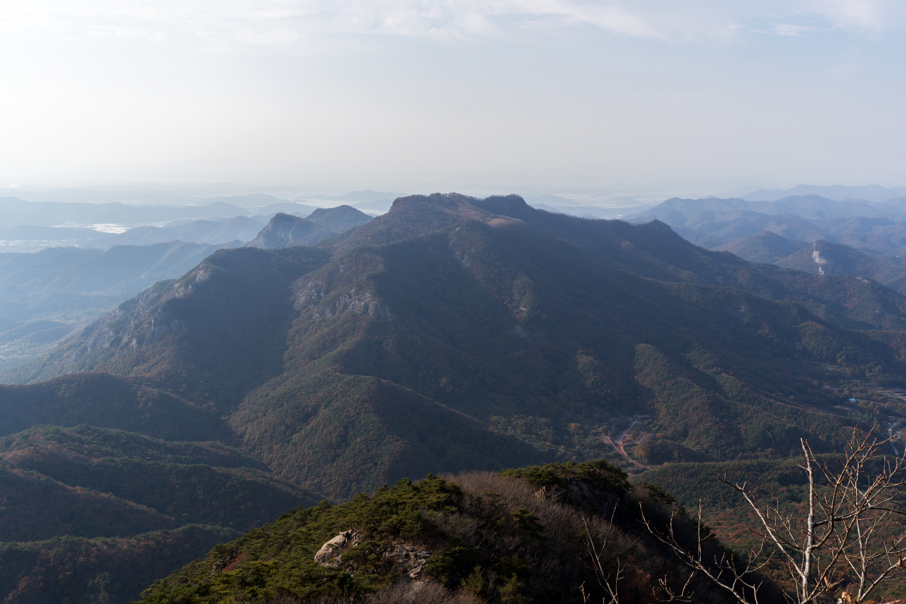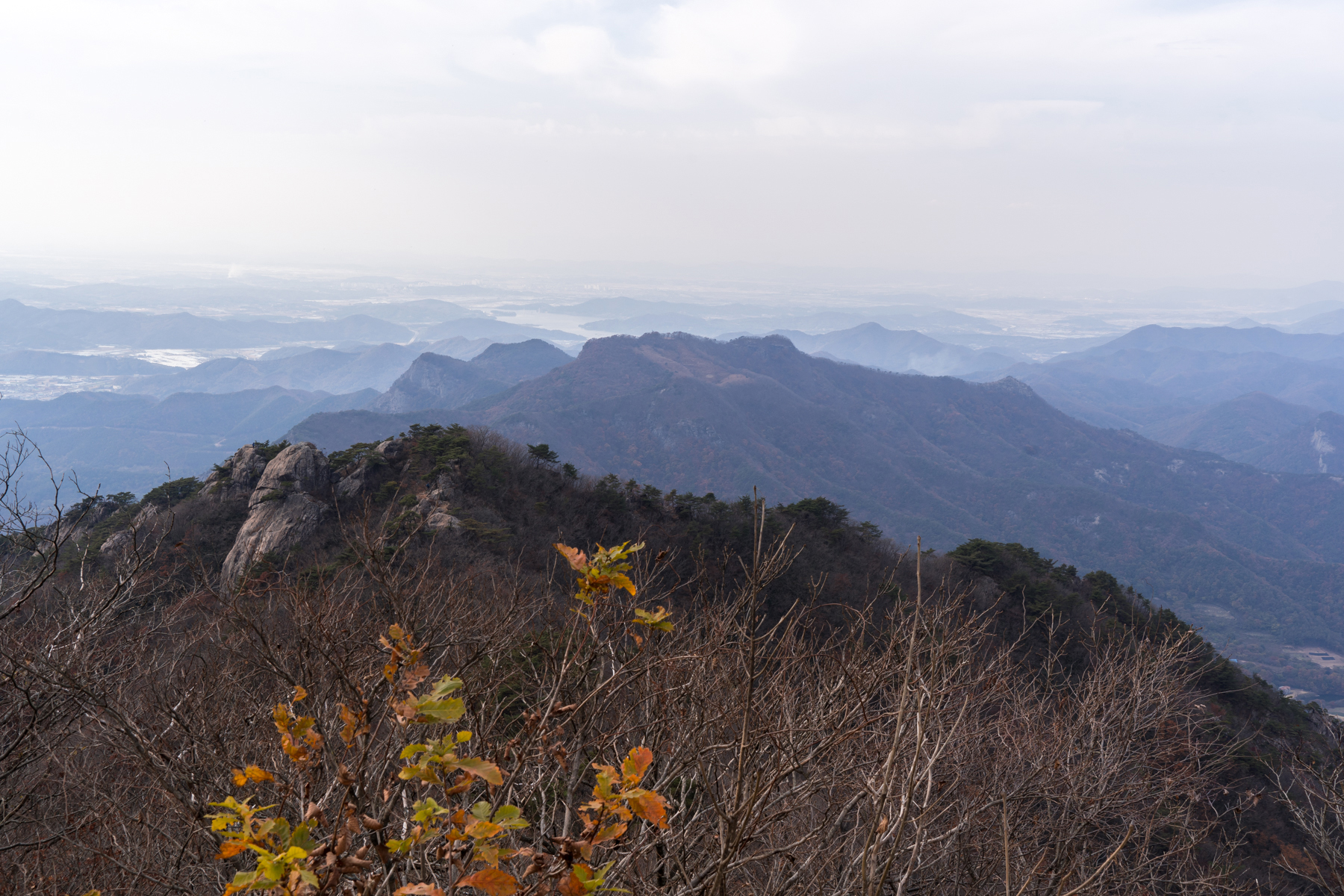 지나온 능선 뒤로는 월성봉과 수락저수지, 그 뒤로 멀리 계룡산이 조망된다.