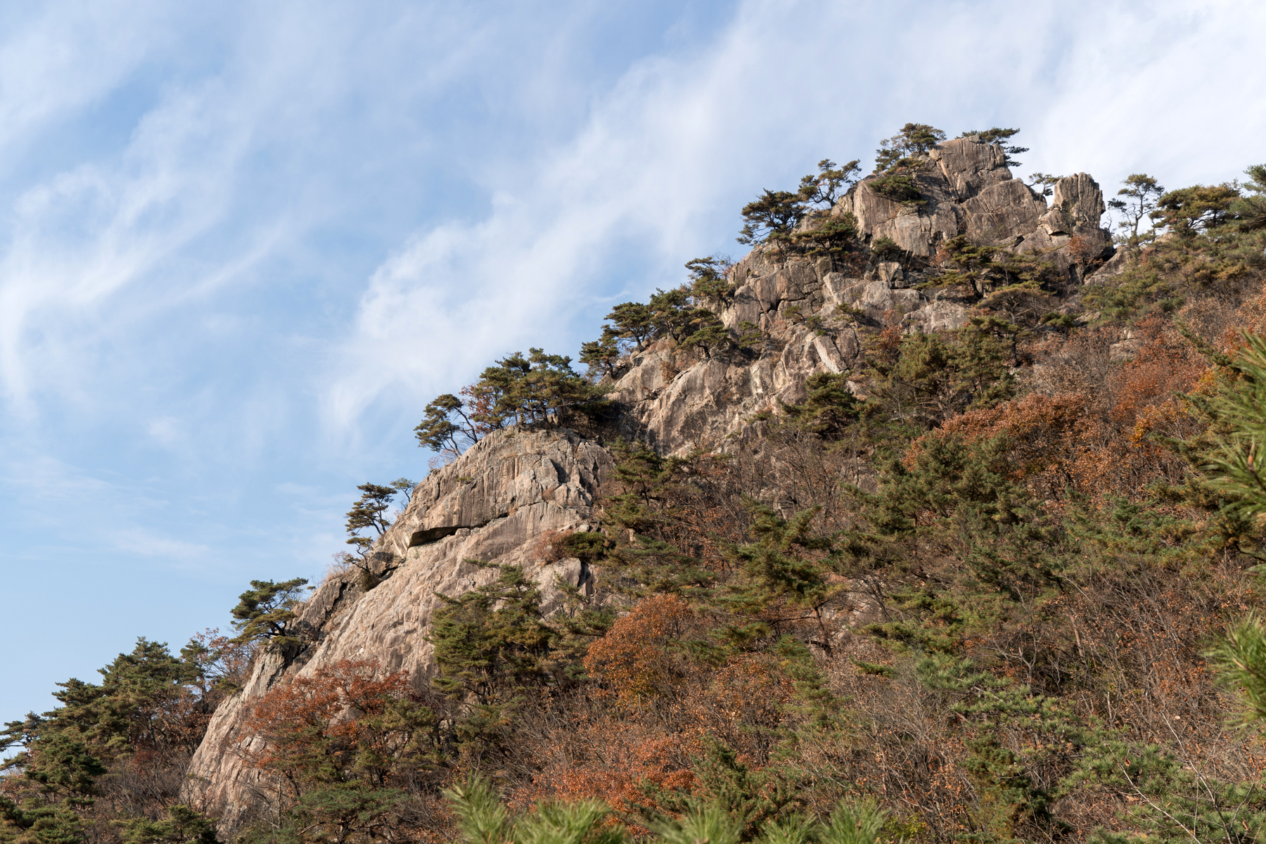 암벽이 형성된 오른쪽 사면과 완만하게 숲을 이루는 왼쪽 지형이 대조를 이룬다.