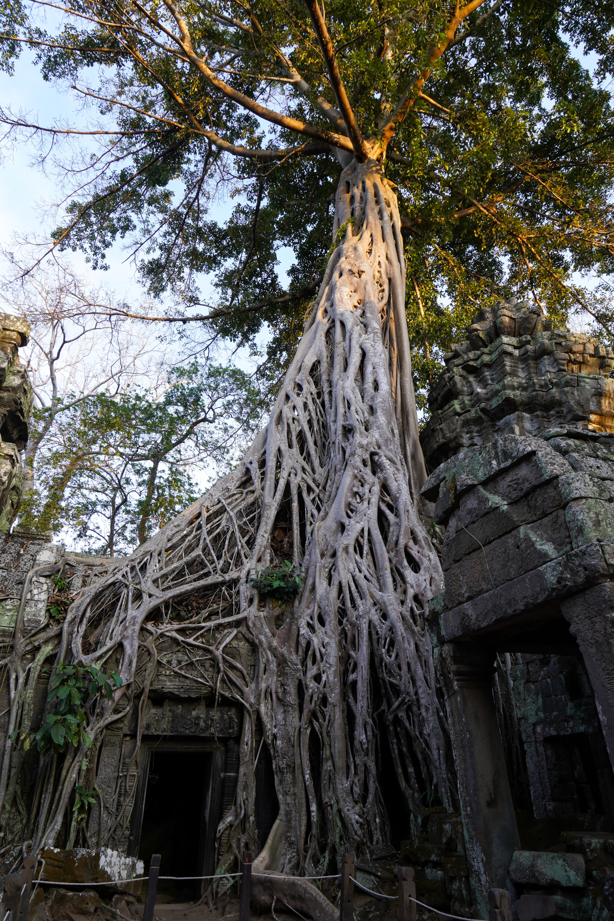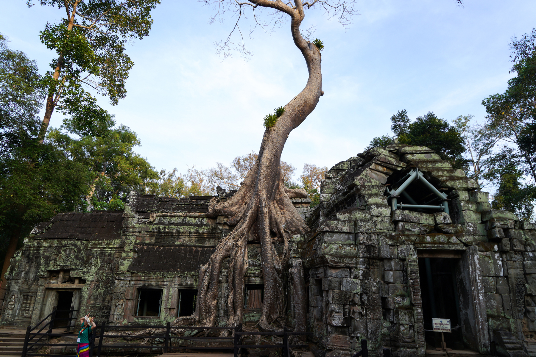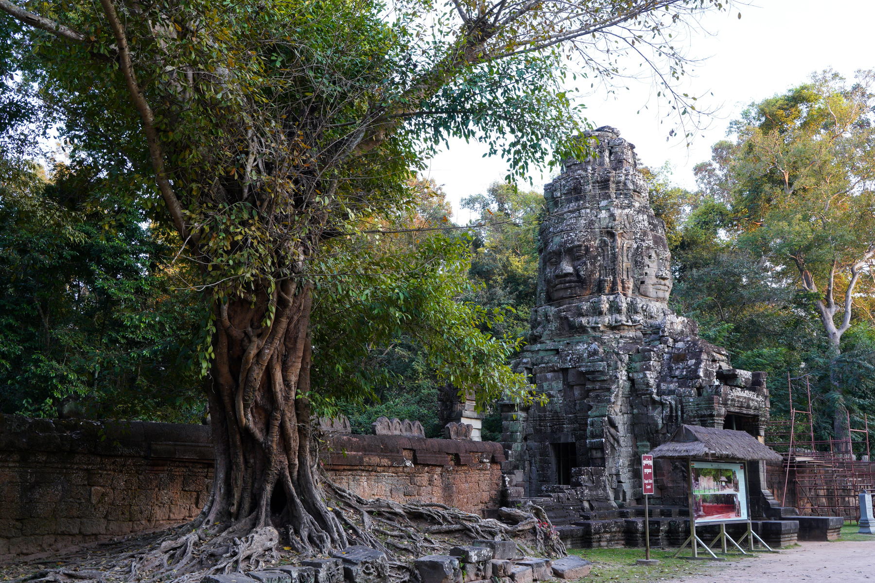 나무의 뿌리가 사원 벽면을 완전히 감싸 건축물의 일부가 된 듯하여 나무를 제거하면 사원이 붕괴될 것 같기도 하다.