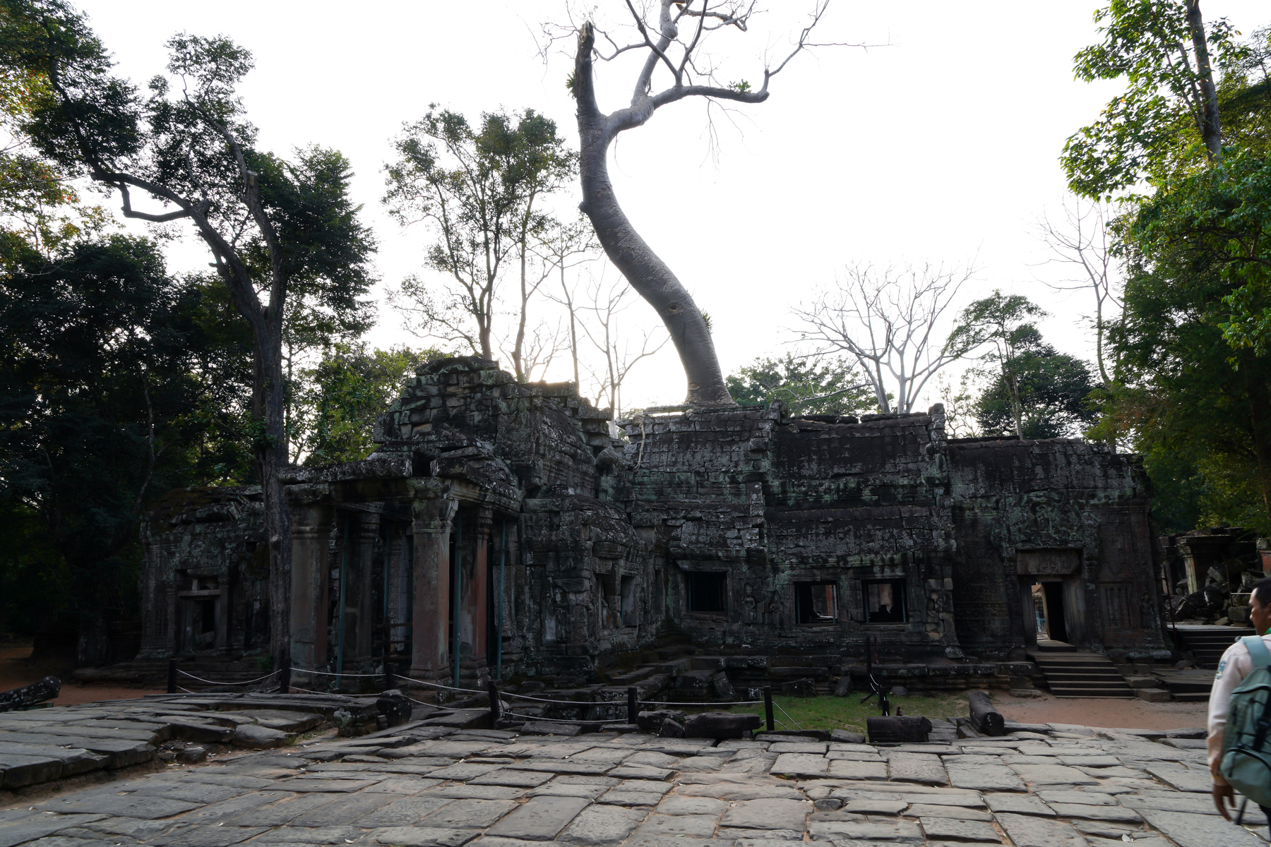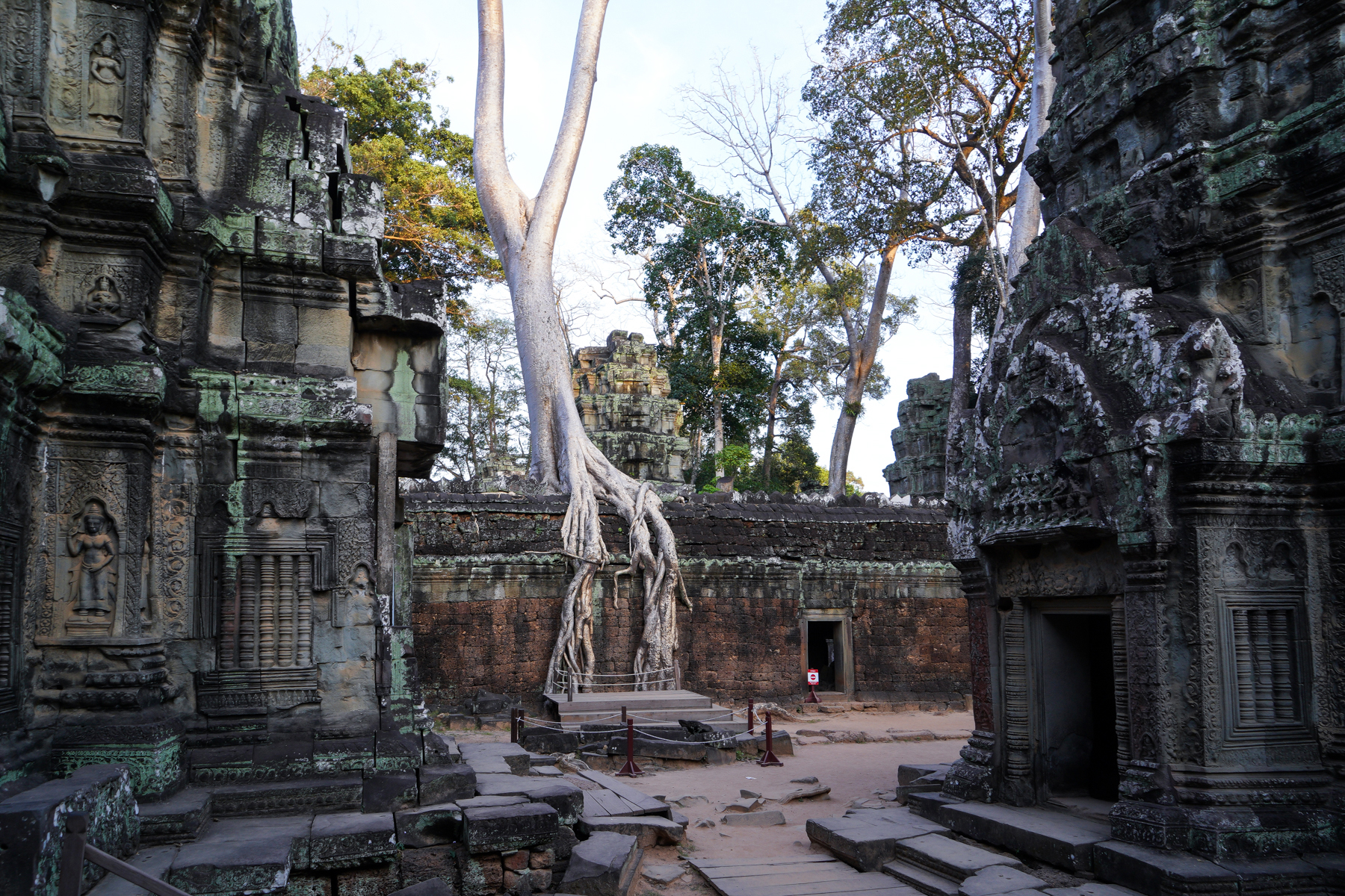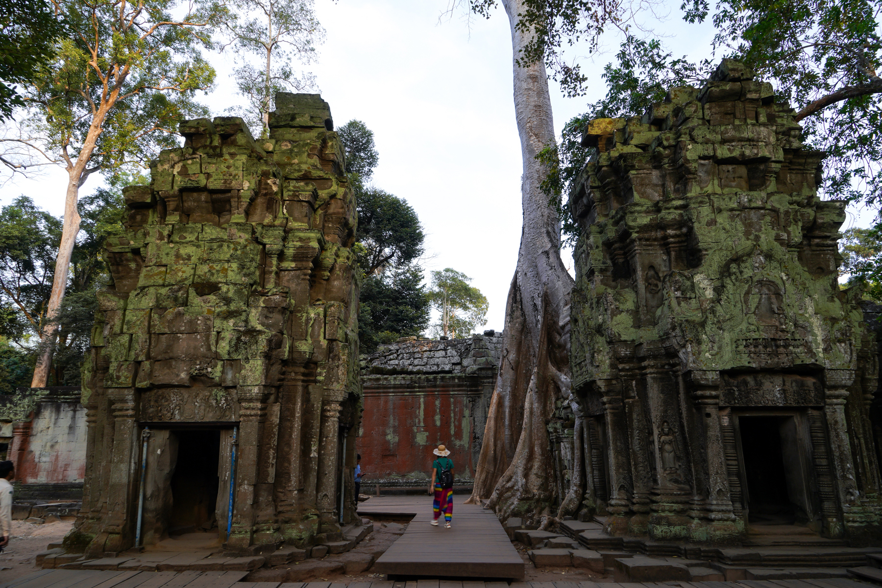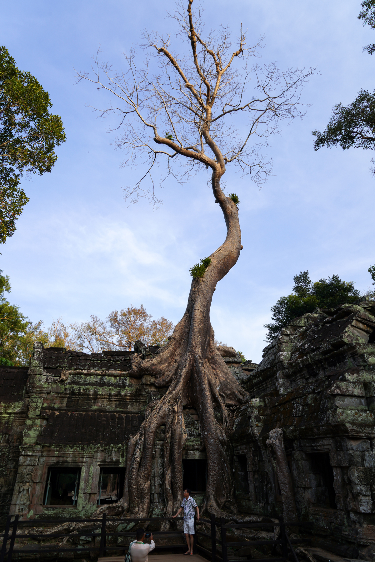 나무의 뿌리가 사원 벽면을 완전히 감싸 건축물의 일부가 된 듯하여 나무를 제거하면 사원이 붕괴될 것 같기도 하다.