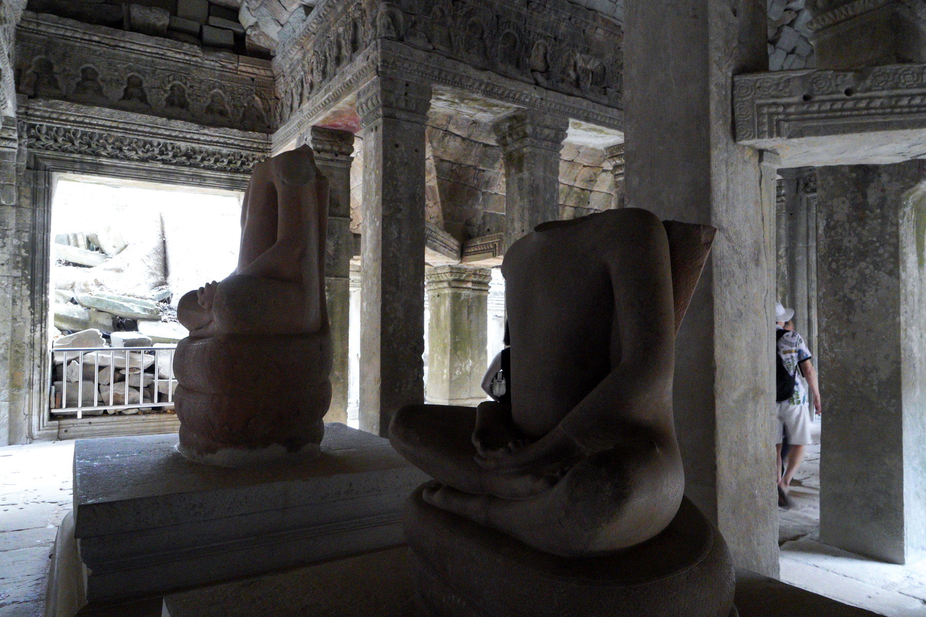사원 내부의 핵심 유물이 될 법한 가부좌상의 머리 부분이 사라졌다. 문화재 도굴꾼들의 만행이 드러나는 안타까운 장면이다.