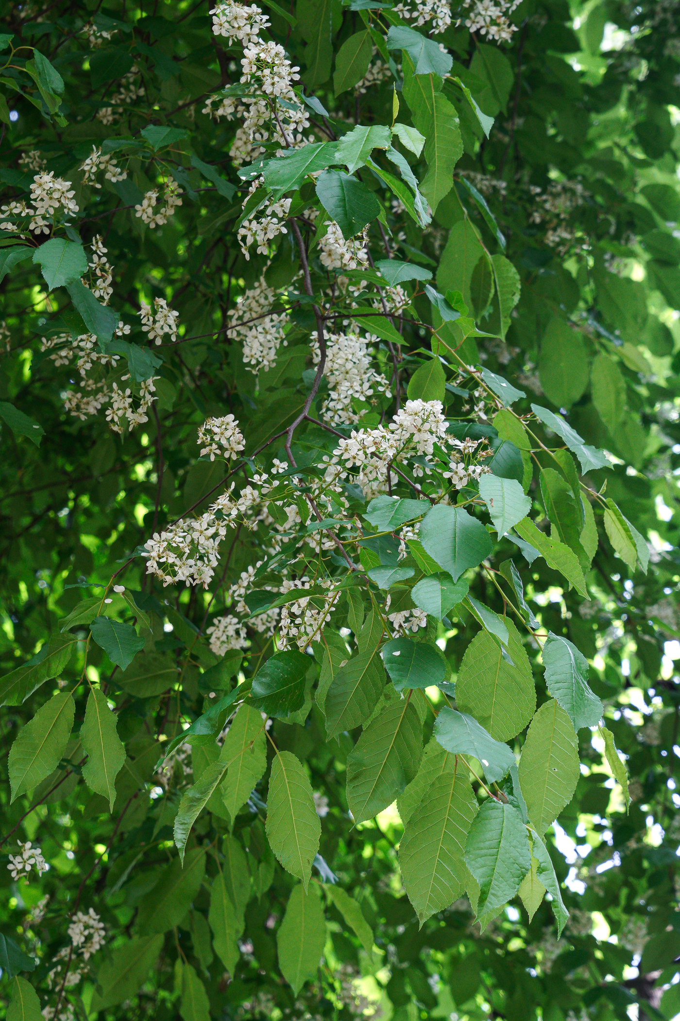 꽃은 5월에 흰색으로 피며 새가지 끝에서 지름 1∼1.5cm의 꽃이 총상꽃차례로 달린다. 꽃차례는 길이 10∼15cm로 털이 없고 밑부분에 잎이 있으며 작은꽃자루에도 털이 없다. 암술은 1개, 수술은 20여개이며 꽃잎과 꽃받침잎은 각각 5개씩이고 꽃받침에는 털이 없다. 꽃이 필 때는 나무 전체가 꽃으로 뒤덮인다. 열매는 핵과로 둥글고 6∼7월에 검게 익는다.