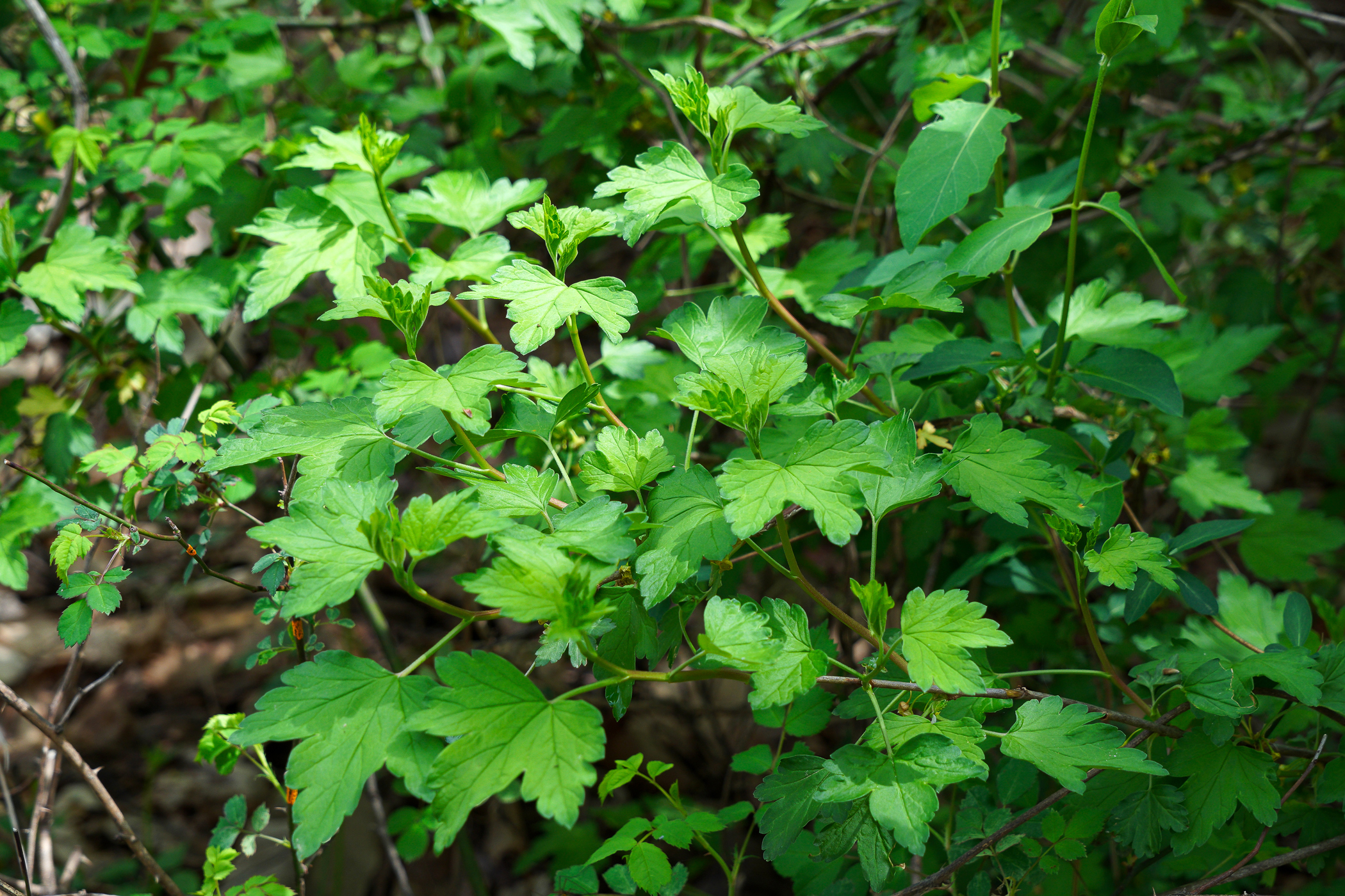 높이 1∼1.5m로 자라고 가지에 가시가 없으며, 나무껍질은 검은 홍자색 또는 녹색이다. 잎은 어긋나고 둥글며 길이 5∼10cm로 3∼5개로 갈라지고 뭉툭한 톱니가 있다. 잎 앞면에는 털이 없으나 뒷면과 잎자루에는 털이 난다. 잎 뒷면은 연한 녹색이고, 잎자루의 길이는 2~3cm이다.