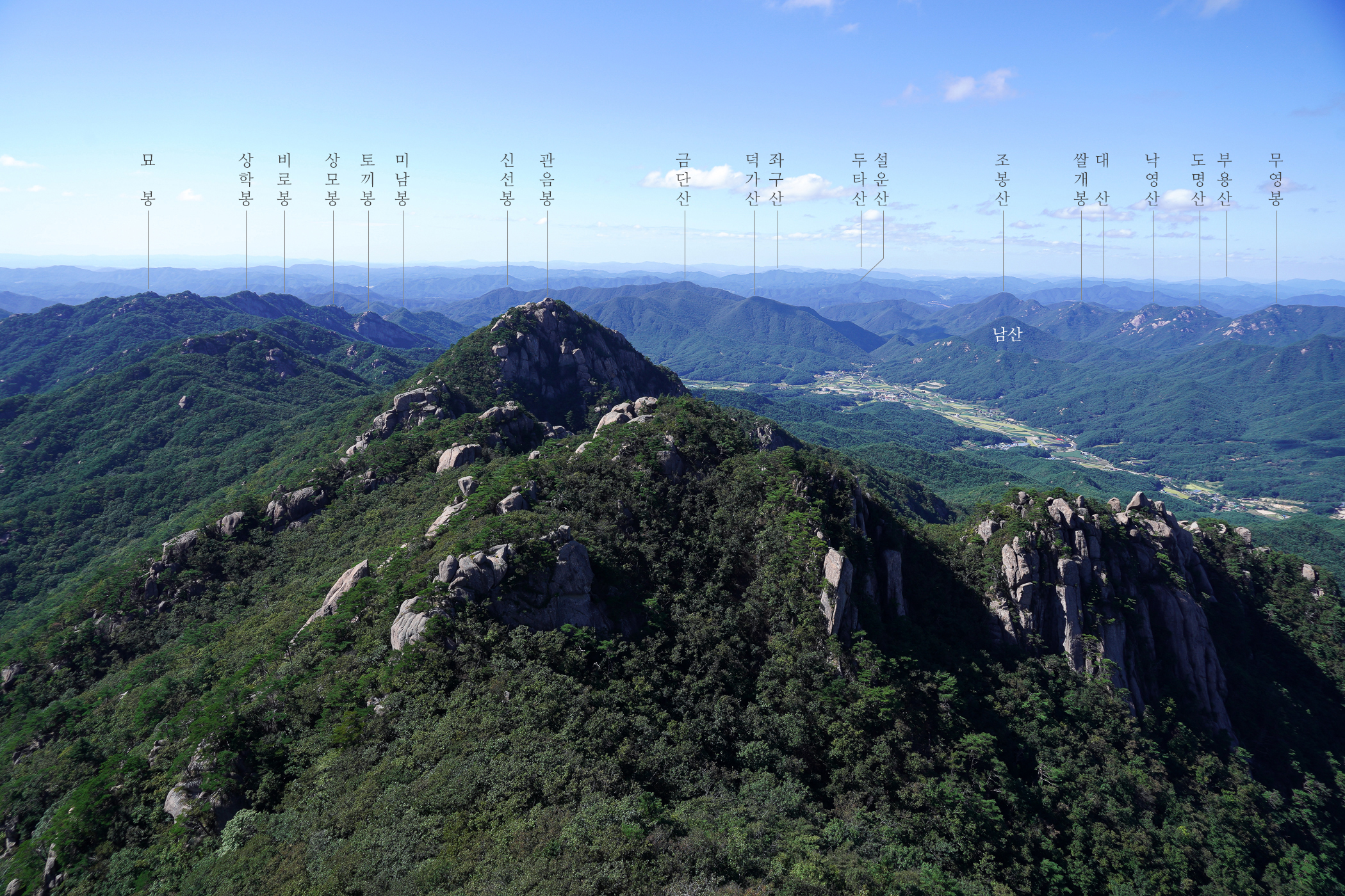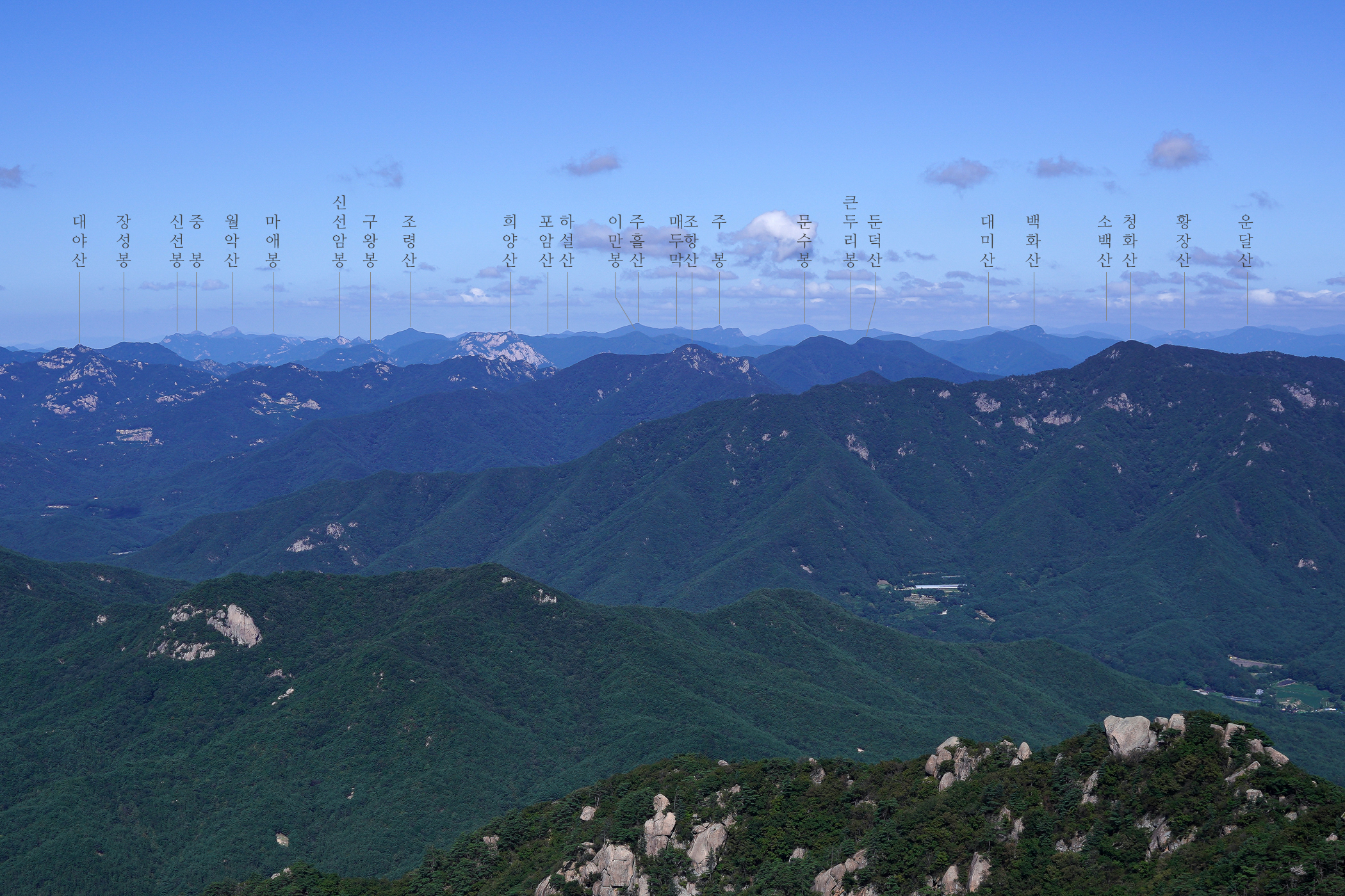오늘은 대기가 상당히 맑다. 문장대에서 사방으로 시야에 들어오는 산들을 살펴본다.
