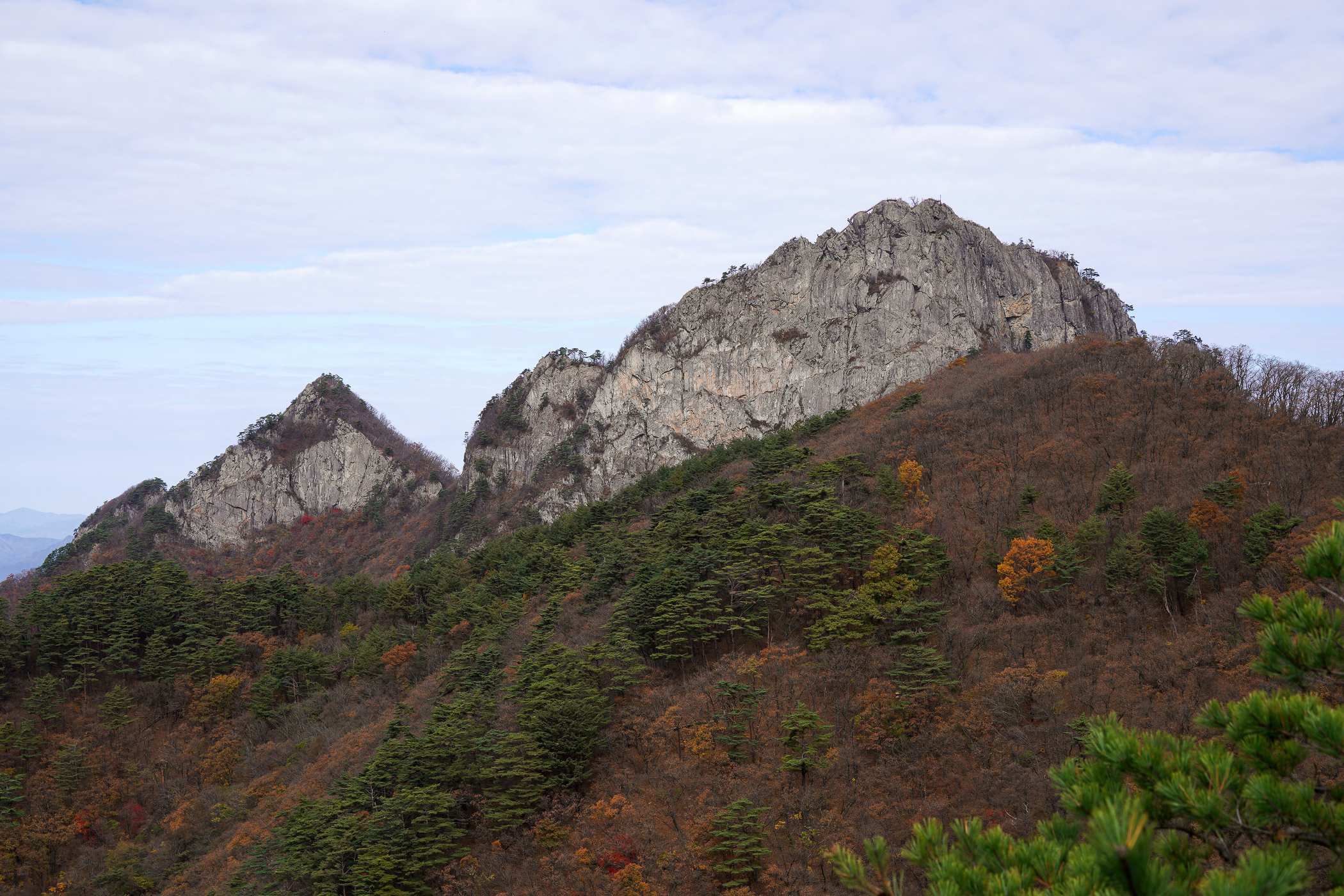 월악산은 특이하게 솟은 암봉의 모습 때문에 멀리서도 쉽게 구별되는 특징이 있다.