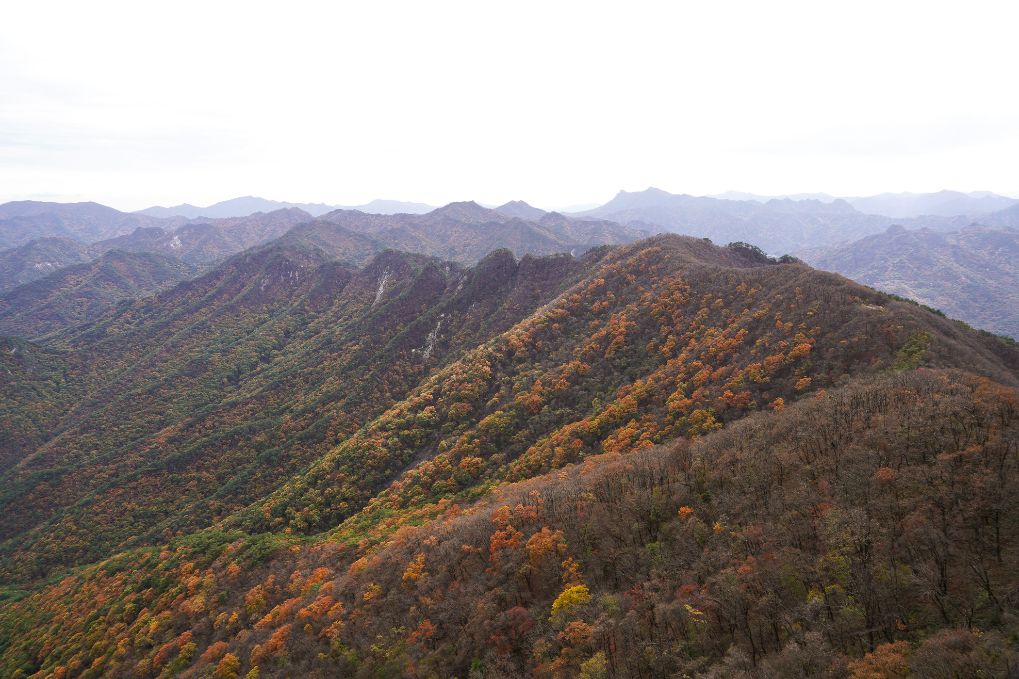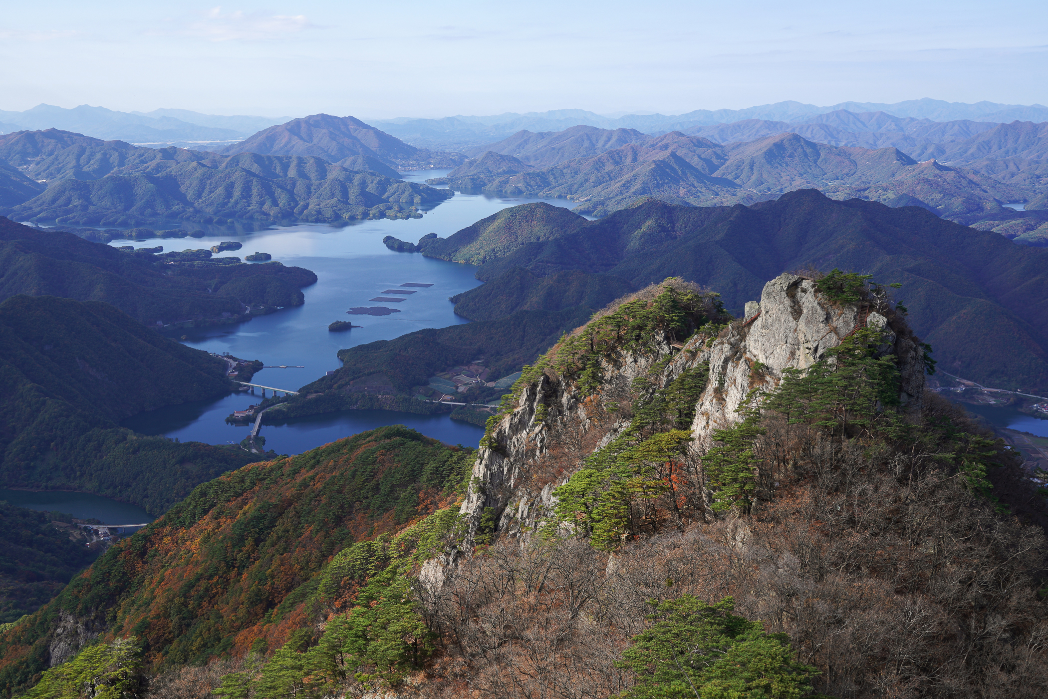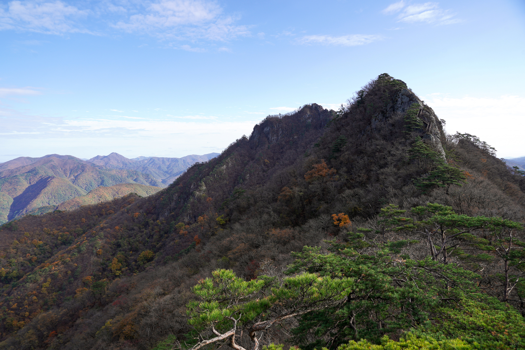영봉에 오르는 철계단은 힘들다기보다 무섭다. 그렇지만 발아래만 보고 걸을 수는 없는 일이다. 가을산의 단풍이 절정을 이루며, 위에서 내려다보는 풍경이 또 다른 멋을 전해준다.