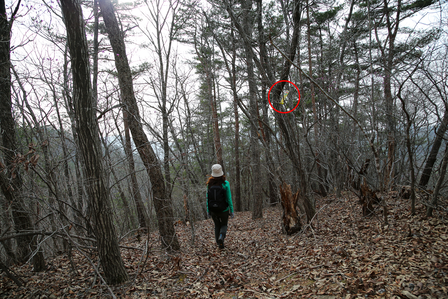 안내도의 갈림길 위치인 안부에서 오른쪽 방향으로 쉽게 노란색 리본(붉은 원)을 발견할 수 있었다. 길은 뚜렷하지 않지만 마지막 하산 방향을 제대로 잡을 수 있었다는 점에서 무척 안도되는 순간이었다.