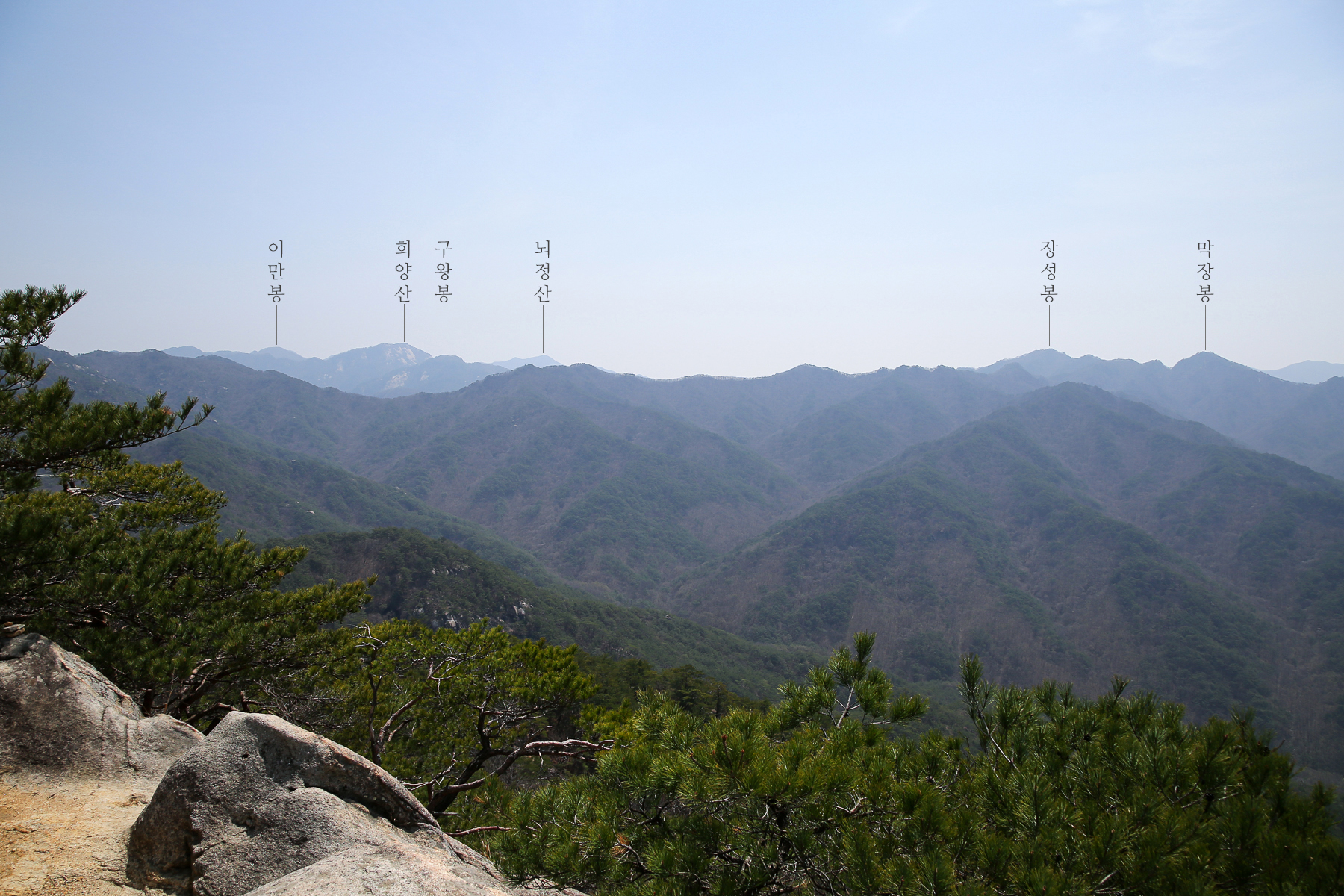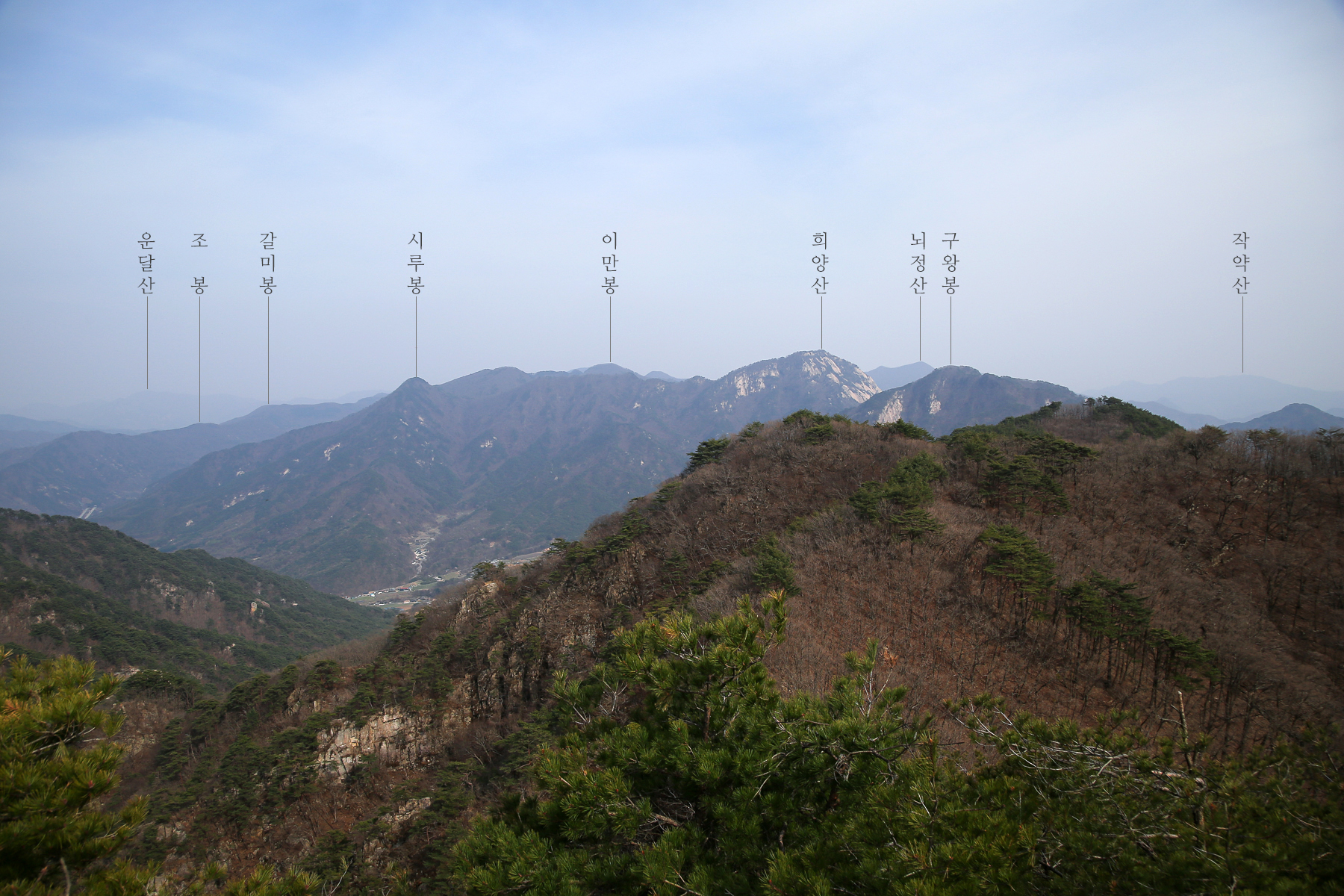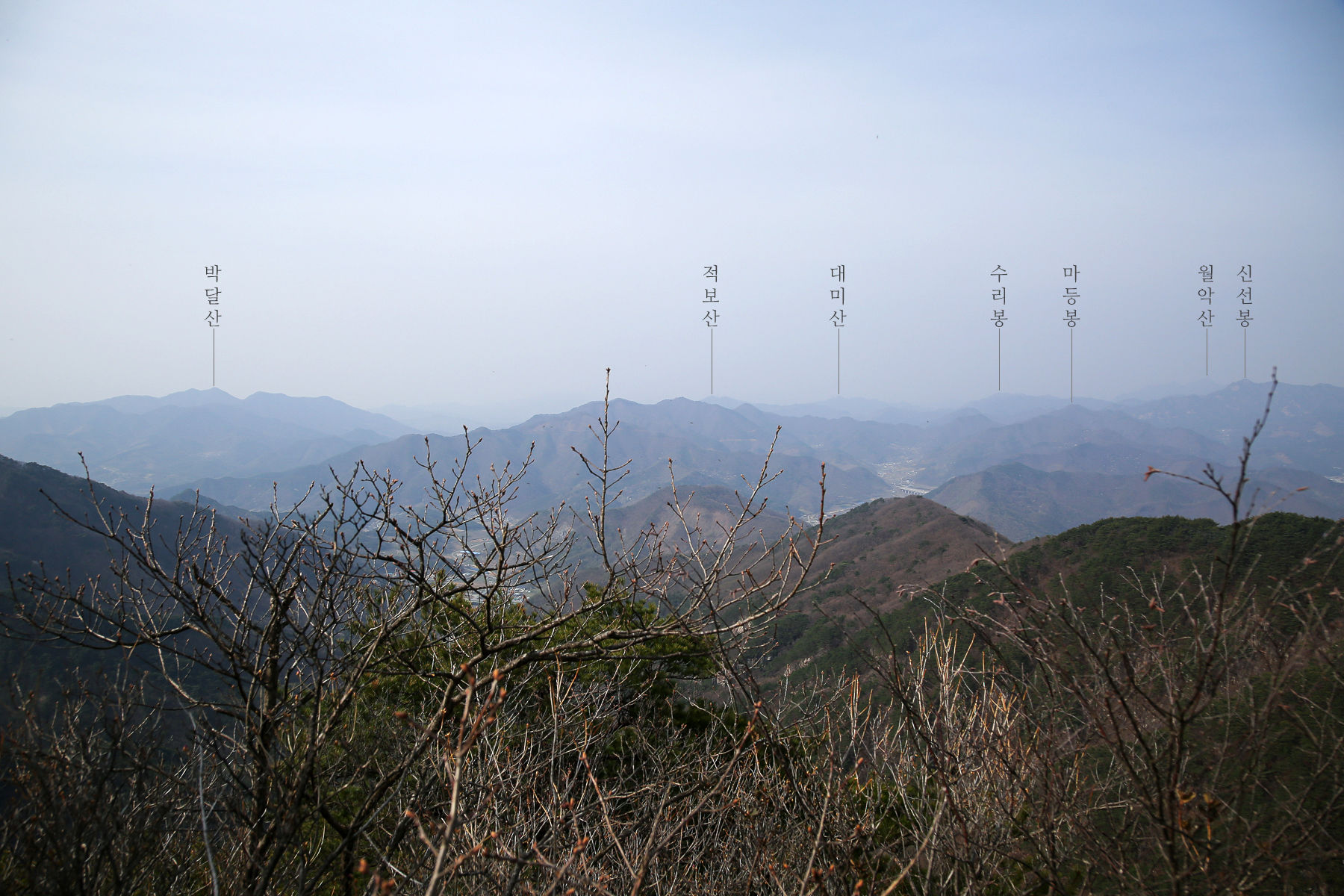 정상 남쪽 전망터에 다가서면 조망이 활짝 트이고 희양산에서 장성봉을 지나 속리산으로 이어지는 백두대간 줄기가 조망된다. 오늘은 미세먼지로 인해 시야가 맑지 못하지만, 정상에서 시야에 들어오는 산들을 최대한 표기해 본다.