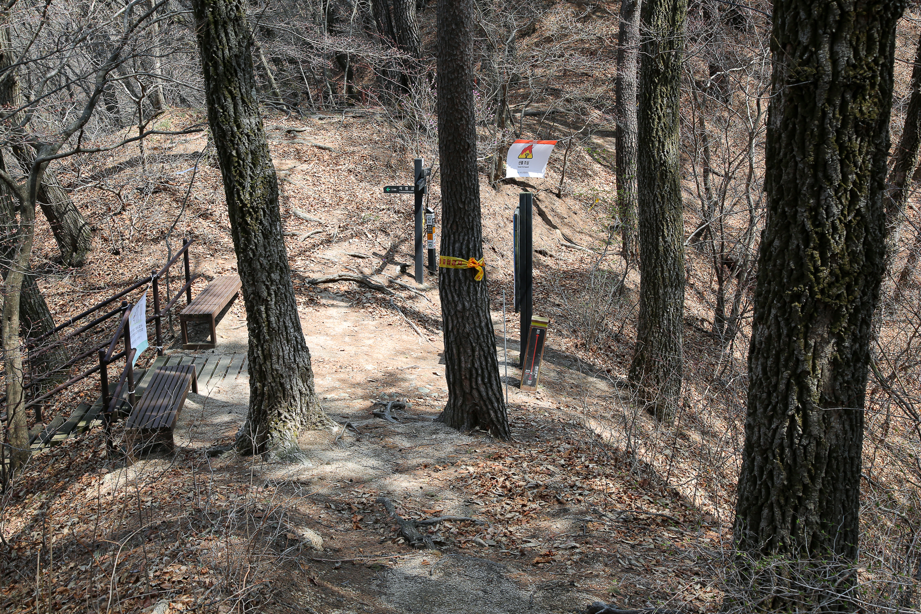 봄꽃이 피어나는 경관을 기대했지만, 칠보산은 아직 이른 봄이다. 간혹 진달래가 보이고 고도를 높이자 노랑제비꽃이 보일뿐이다. 길은 청석재까지 완만한 경사가 이어지고 그 이후 정상까지 가파른 경사의 계단을 따라 오른다.