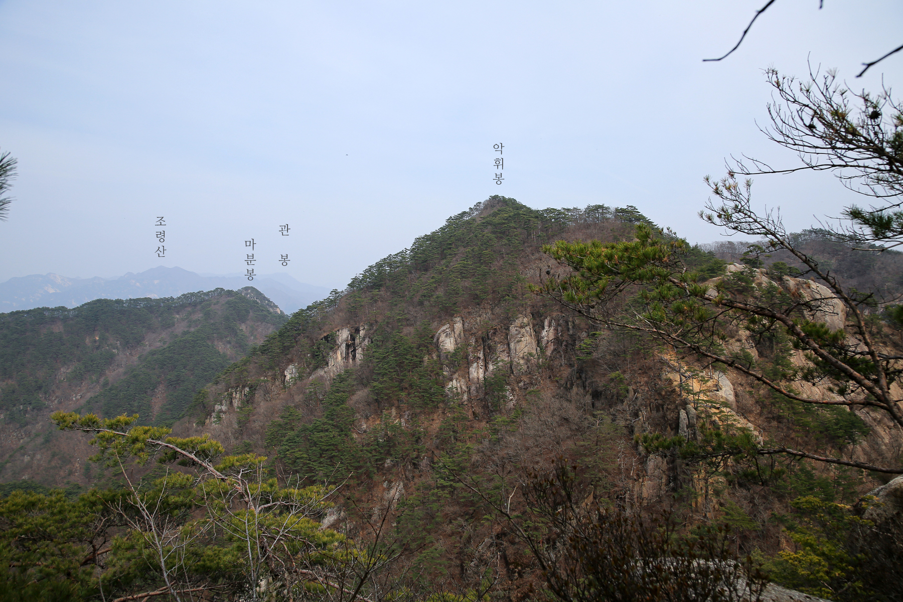 악휘봉 정상의 조망은 시원하게 열려 있지만, 북쪽의 덕가산 방향과 북서쪽의 군자산 방향은 나무에 가려져 있다. 오늘도 날씨가 흐리고 미세먼지가 짙어 원경이 선명하지 못하지만, 최대한 주변 산들을 조망해 본다.