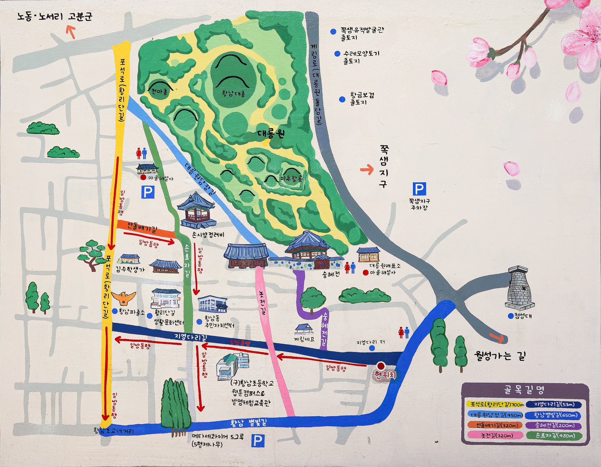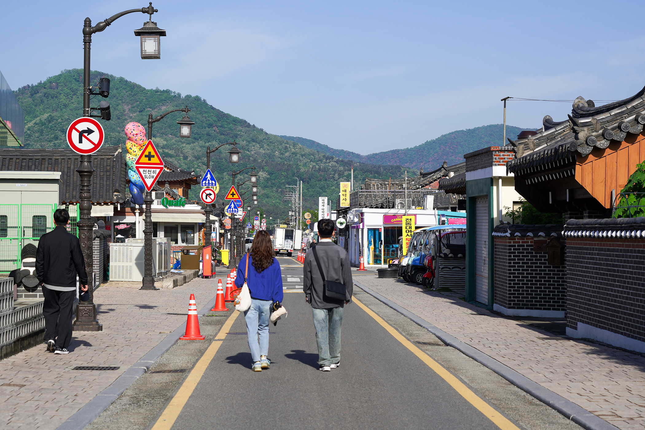 어제는 비가 내리는 가운데 많은 차량들로 혼잡했던 거리다. 이를 감안하여 조금 이른 시간에 황리단길에 도착하여 아침 식사 장소로 향한다. 황리단길은 서울 이태원 경리단길처럼 젊은 층의 취향을 저격하는 매장들이 들어선 데서 붙은 이름으로, '황남동의 경리단길'이라는 뜻을 가지고 있다. 어제와 달리 맑게 개인 쾌청한 날씨 속에 역사 유적지 경주에서의 하루를 시작한다.