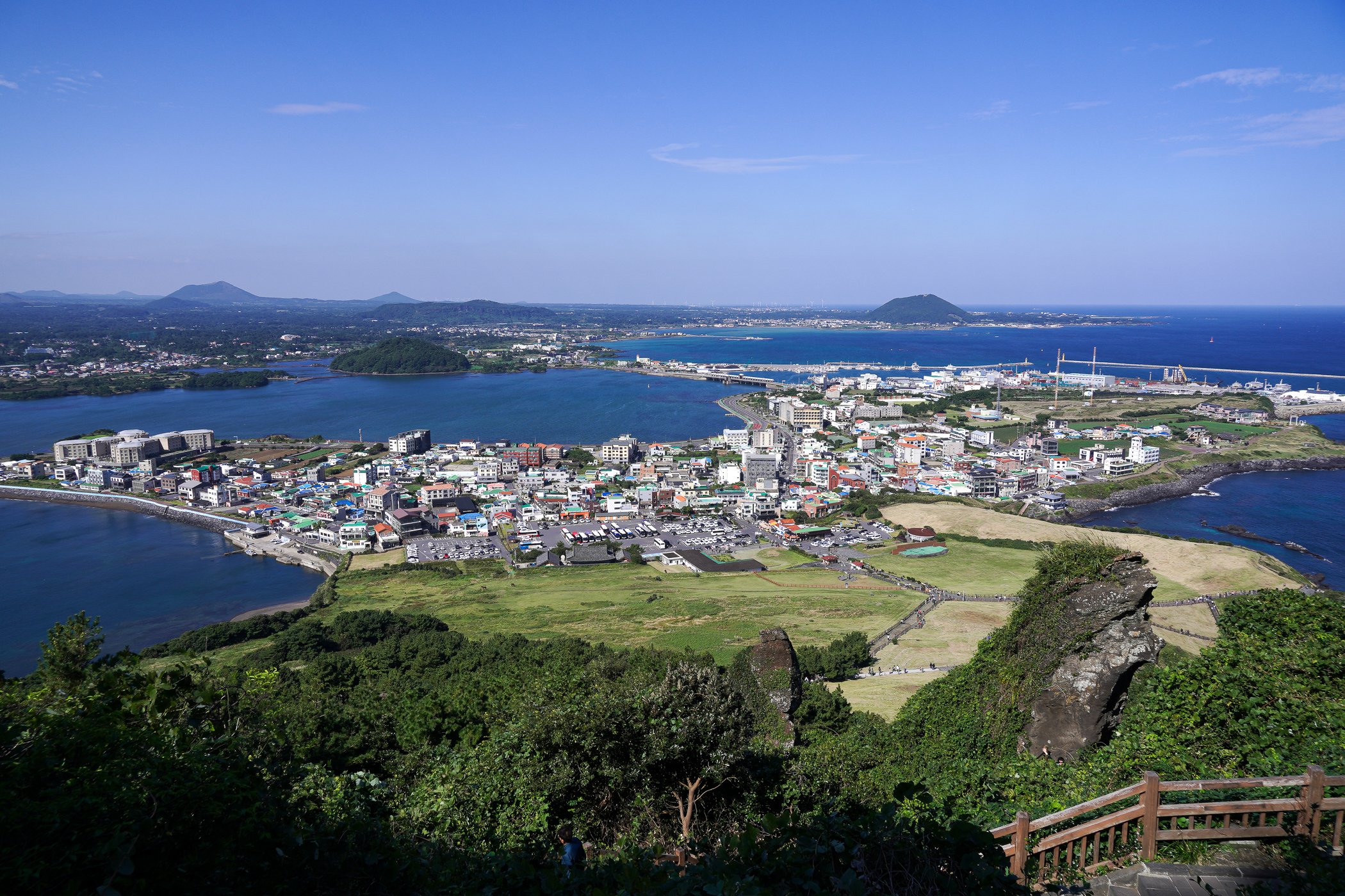 일출봉을 내려서며 보이는 해안 풍경과 오름들