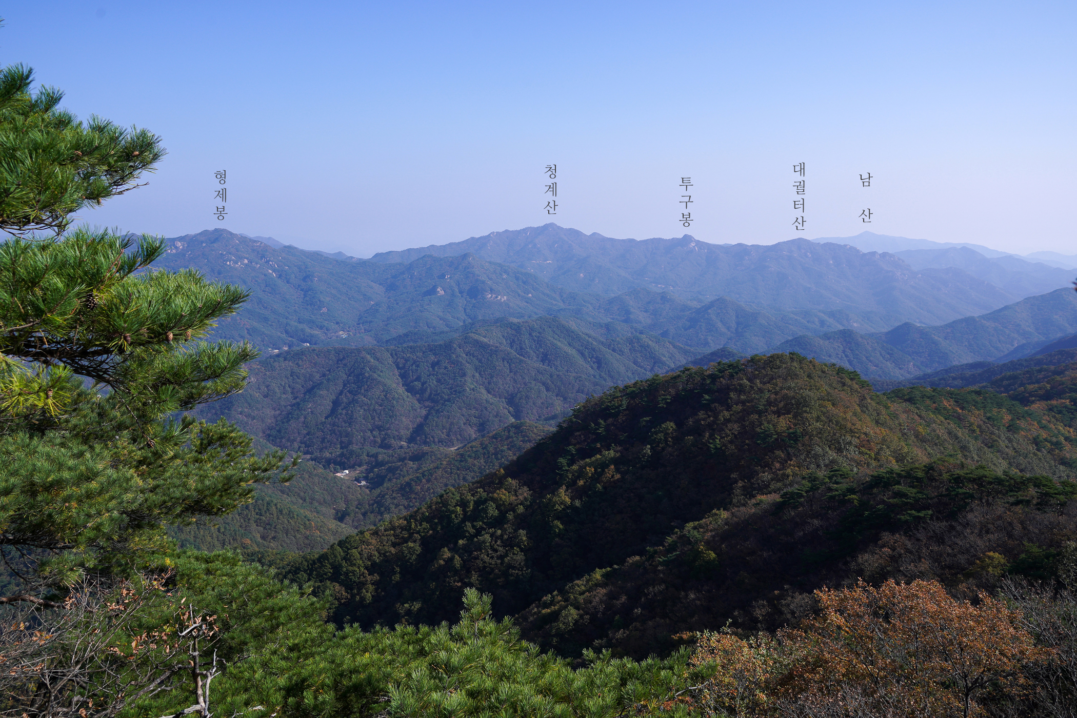 봉황산 왼쪽에는 청계산 두리봉에서 대궐터산으로 이어지는 산줄기가 펼쳐있고, 그 왼쪽으로 속리산 형제봉이 살짝 모습을 드러낸다. 신선대에서 형제봉까지는 6.5km 거리의 충북알프스 등산로가 이어진다.