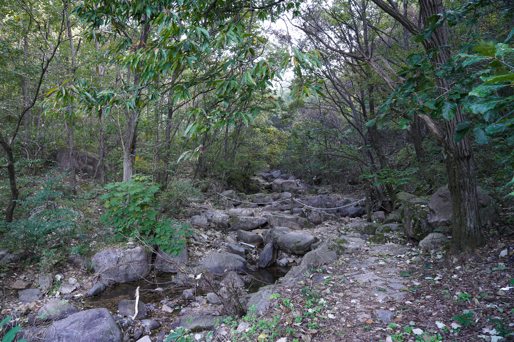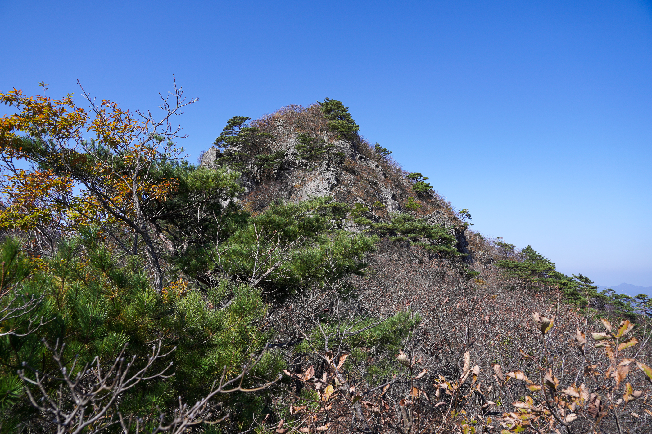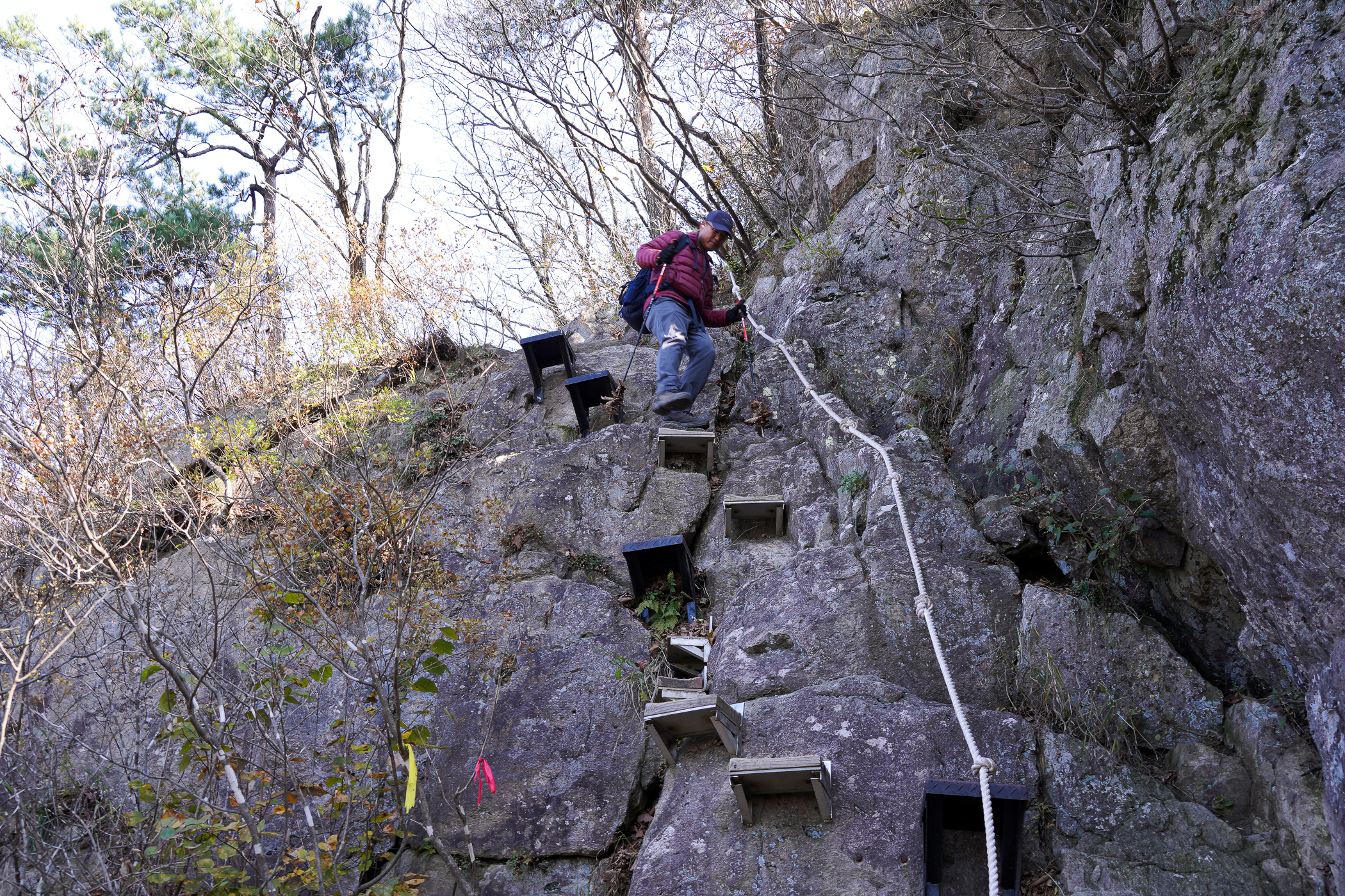정상에서 다시 안부로 내려와 위성지국(~2.6km) 방향으로 하산한다. 약 30여분 내려서자 바위 절벽이 앞을 막아선다. 이쪽 코스는 계속해서 바위들이 많은 계곡길로 발걸음이 매우 조심스럽다.