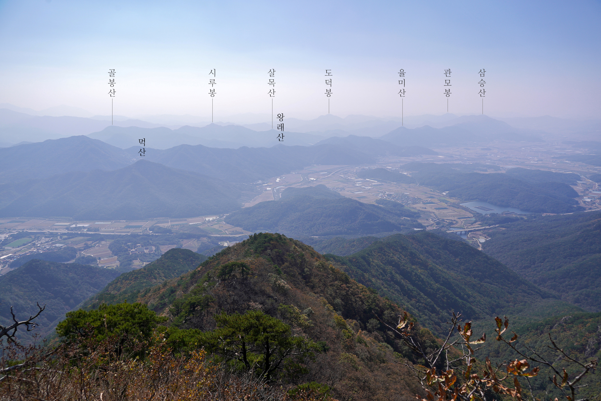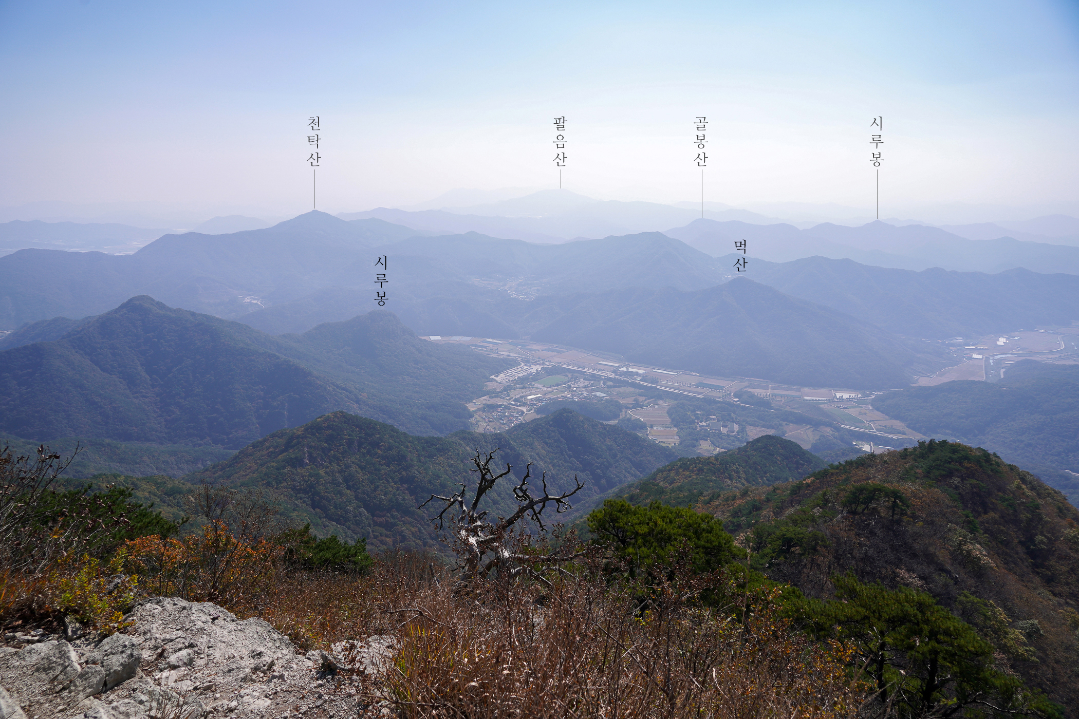 신선대에서는 동쪽 방향으로 전망이 트이는데, 오늘은 연무가 심해 원경이 깨끗하지 못하다. 동쪽에 백두대간 봉황산이 보이고 그 뒤로 상주의 노음산이 희미하게 보인다.