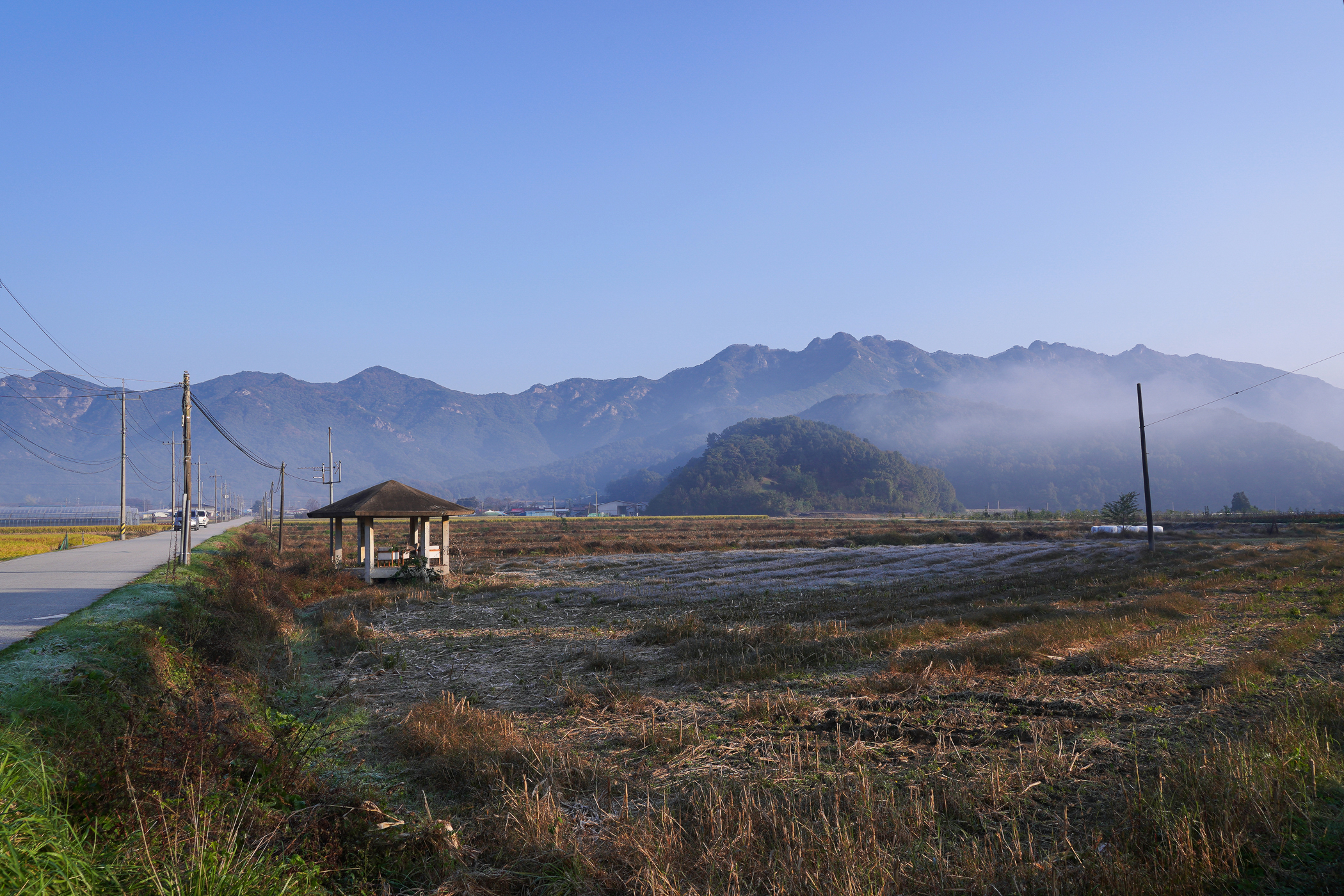 산행 출발지로 가는 중에 인근의 갈평리 마을 입구에서 아침 안갯속에 구병산이 보인다.