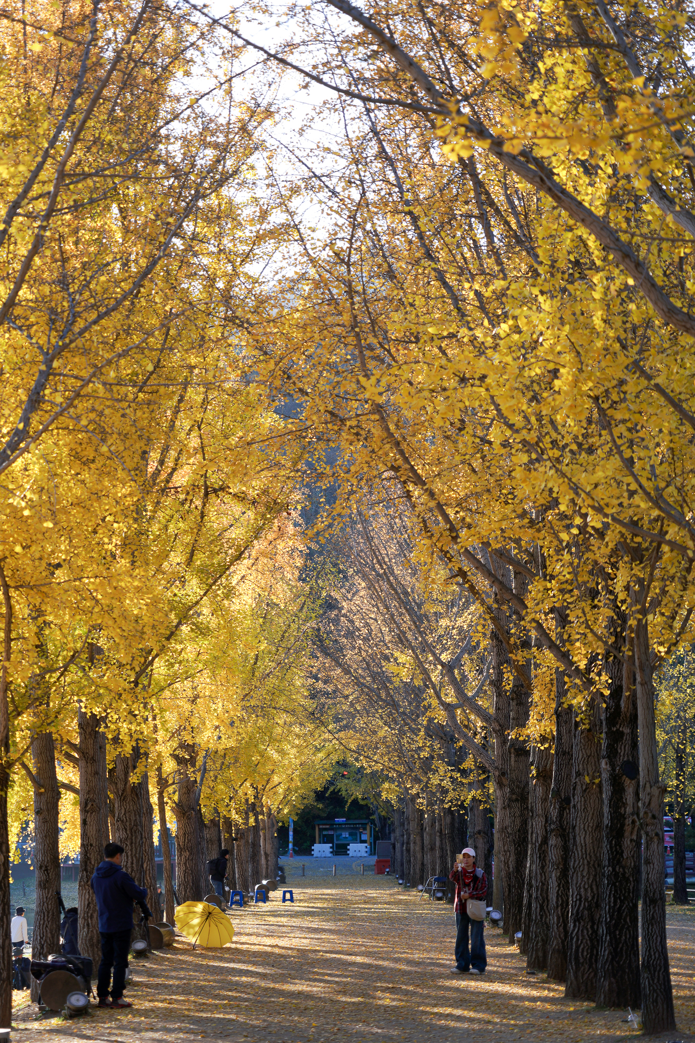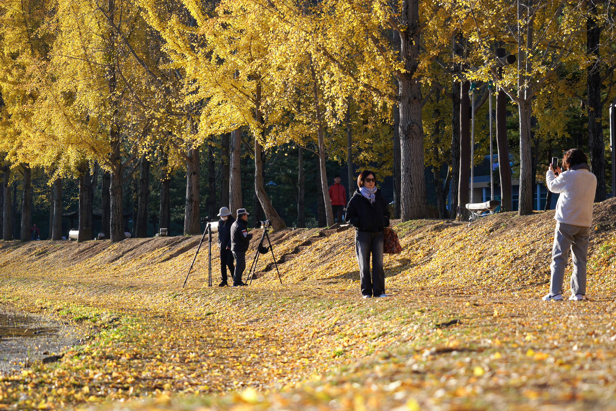 노랗게 물든 은행잎에 햇살이 비추면서 풍경은 사뭇 달라져 보인다. 물안개 피어나는 몽환적인 풍경은 볼 수 없었지만 대신 아침 햇살에 반짝이는 은행나무 풍경을 담아본다.
