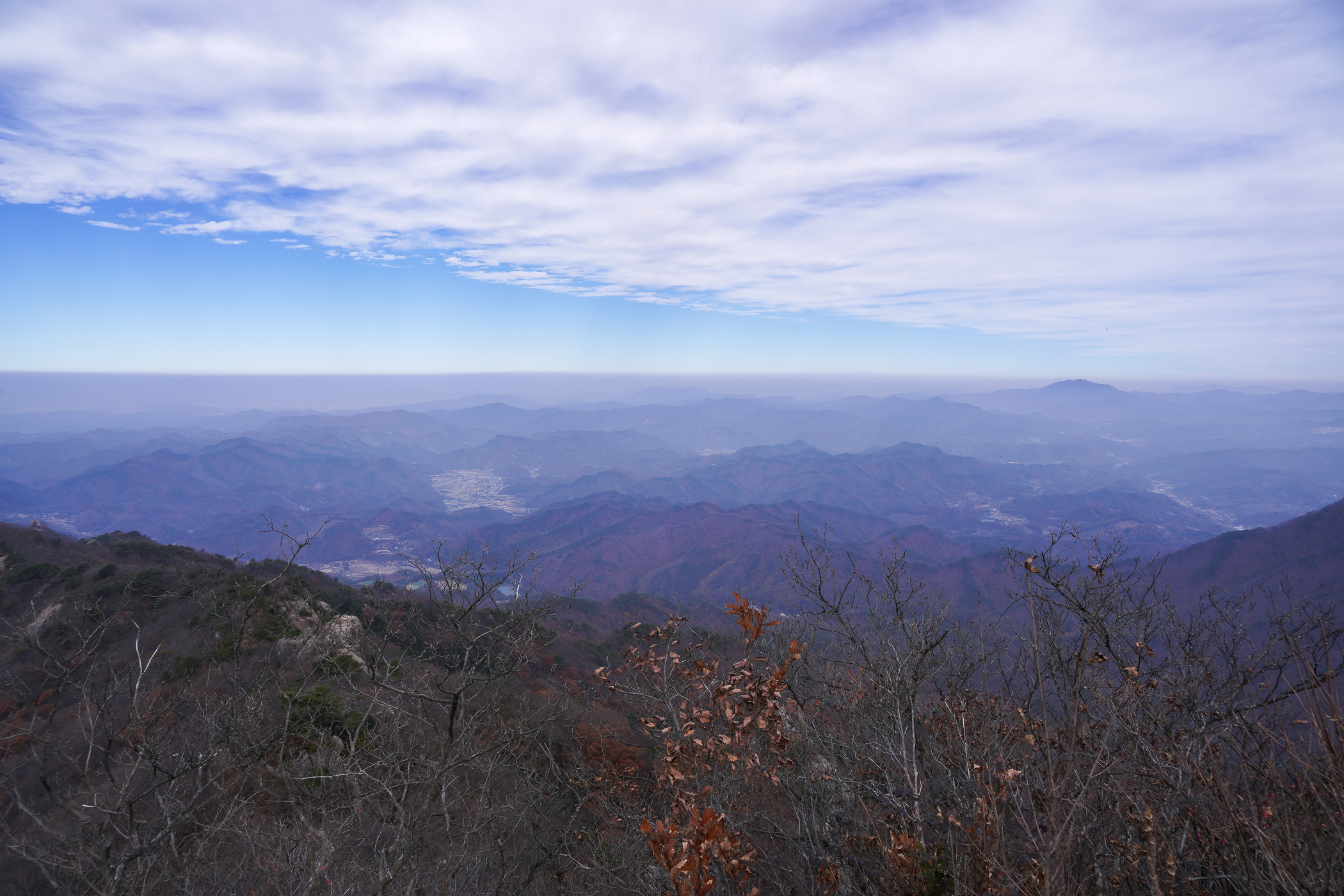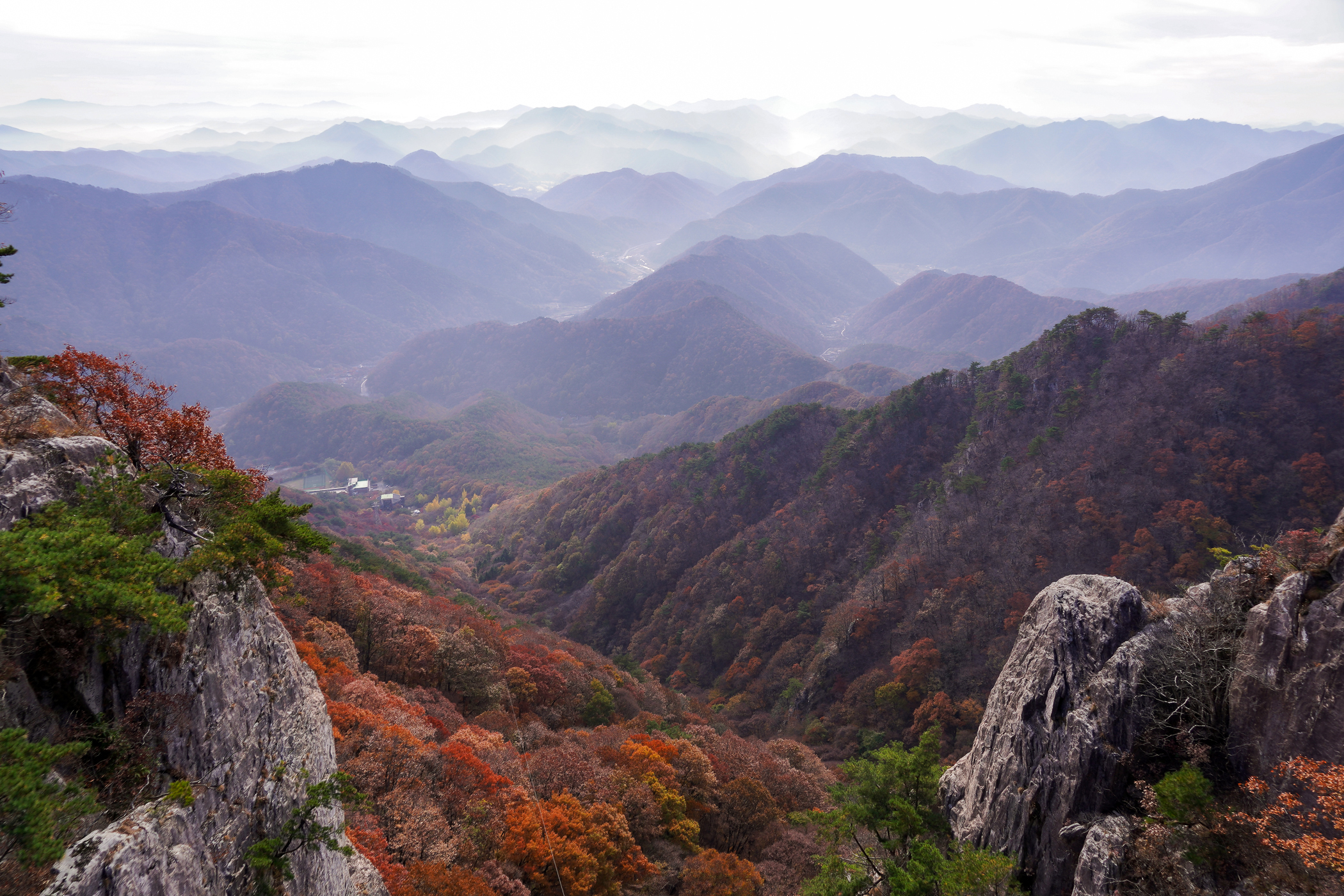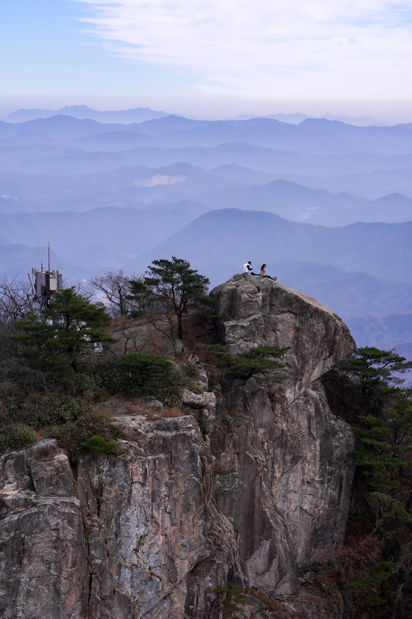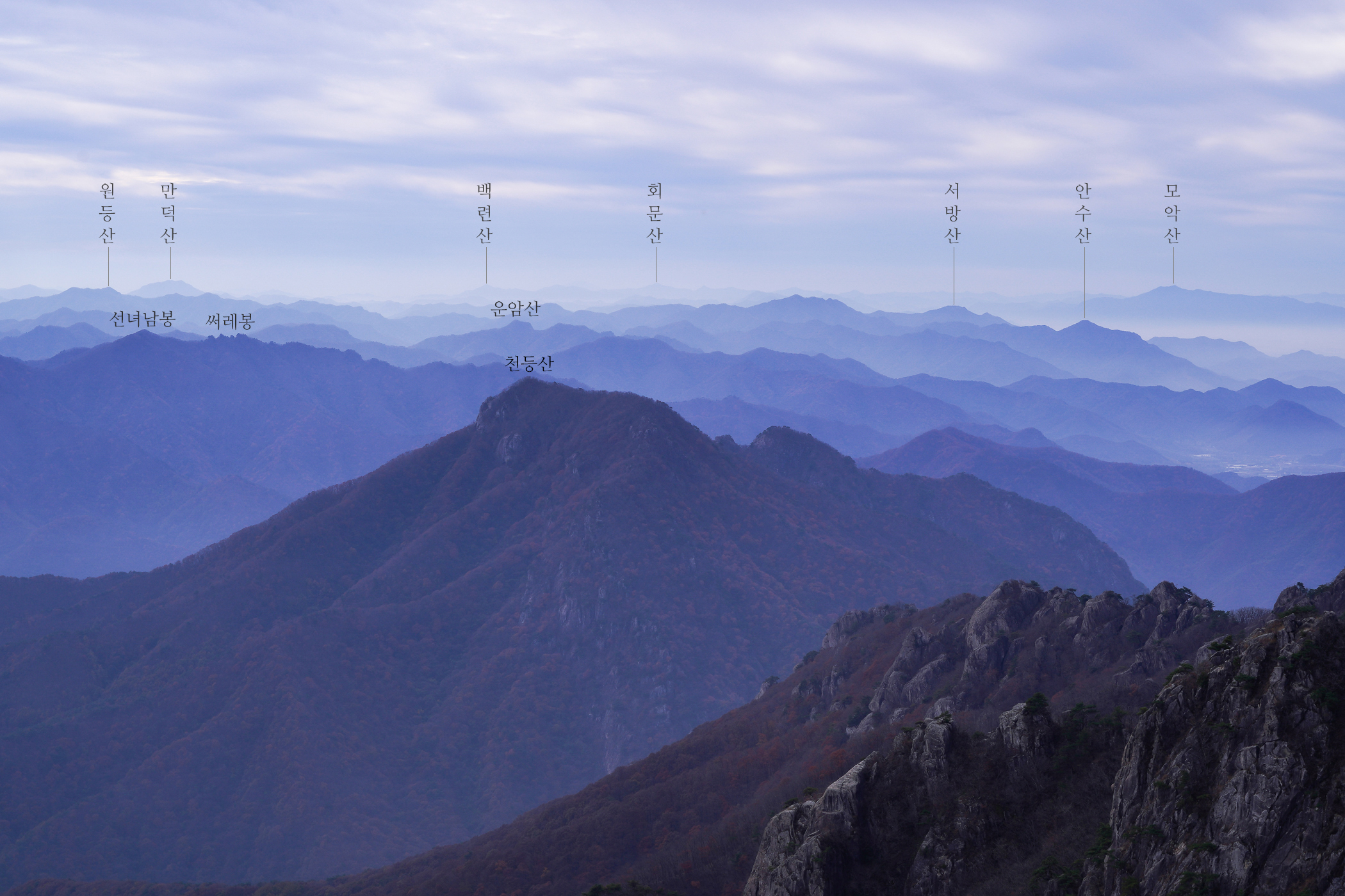 옅은 안개가 드리워진 가운데 먼산 마루가 파도치듯 펼쳐 보이는 장면은 대둔산에서 볼 수 있는 아름다운 경관 중 하나다. 동쪽 끝으로 경북 김천 황악산과 충북 영동 민주지산 마루가 보인다.