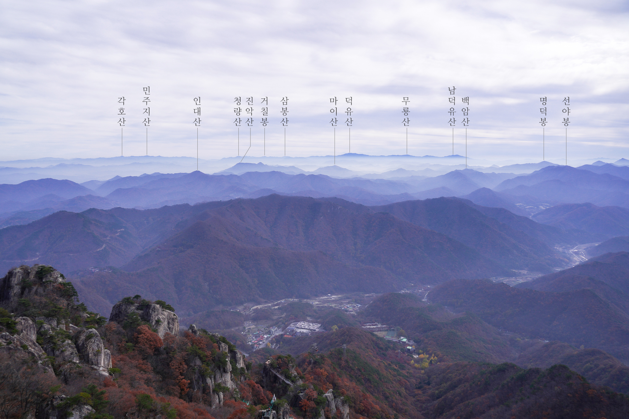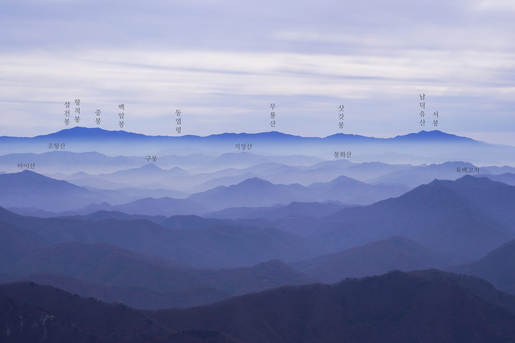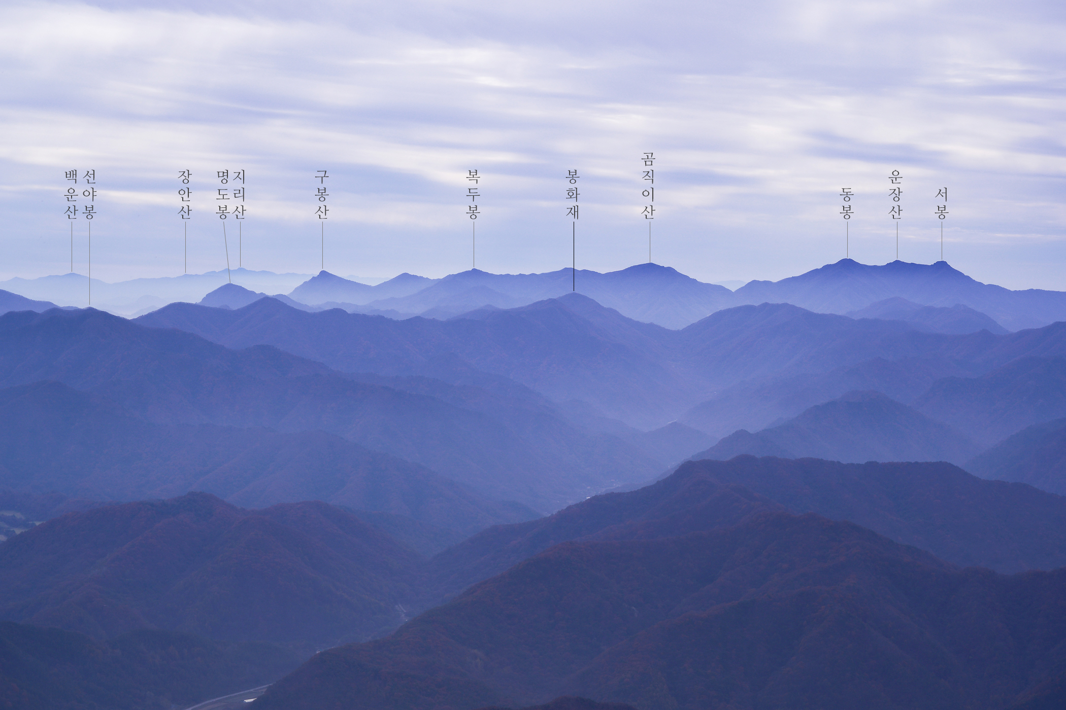 동남쪽에는 금산의 명산 진악산과 선야봉, 백암산이 보이고 그 뒤로 덕유산 향적봉에서 남덕유산에 이르는 덕유산 줄기가 안개 위로 솟아있다.