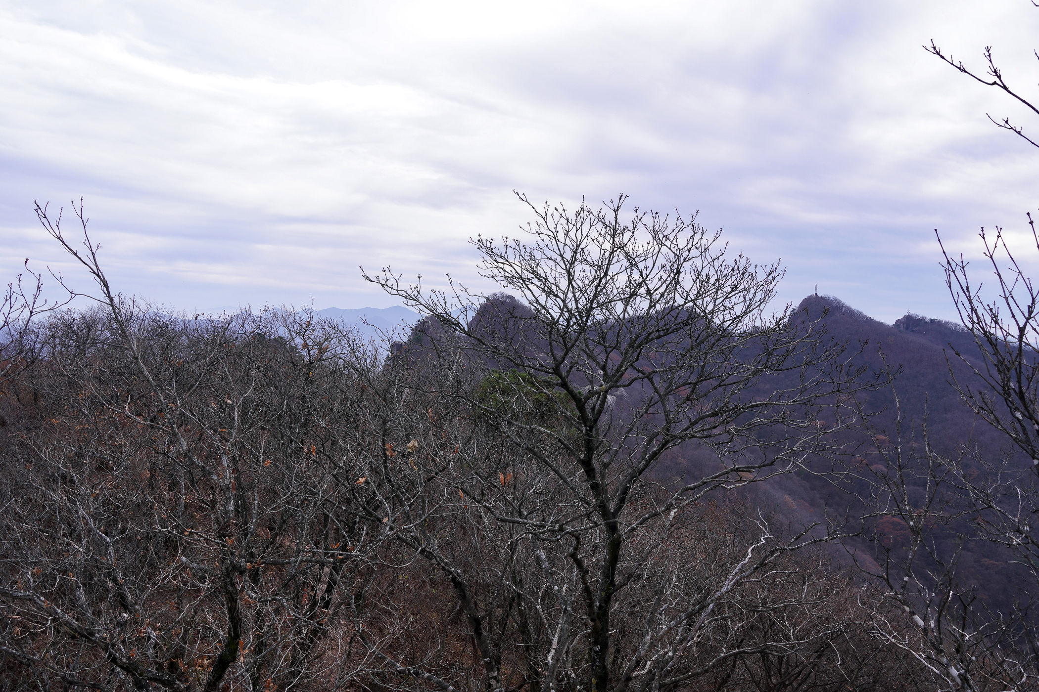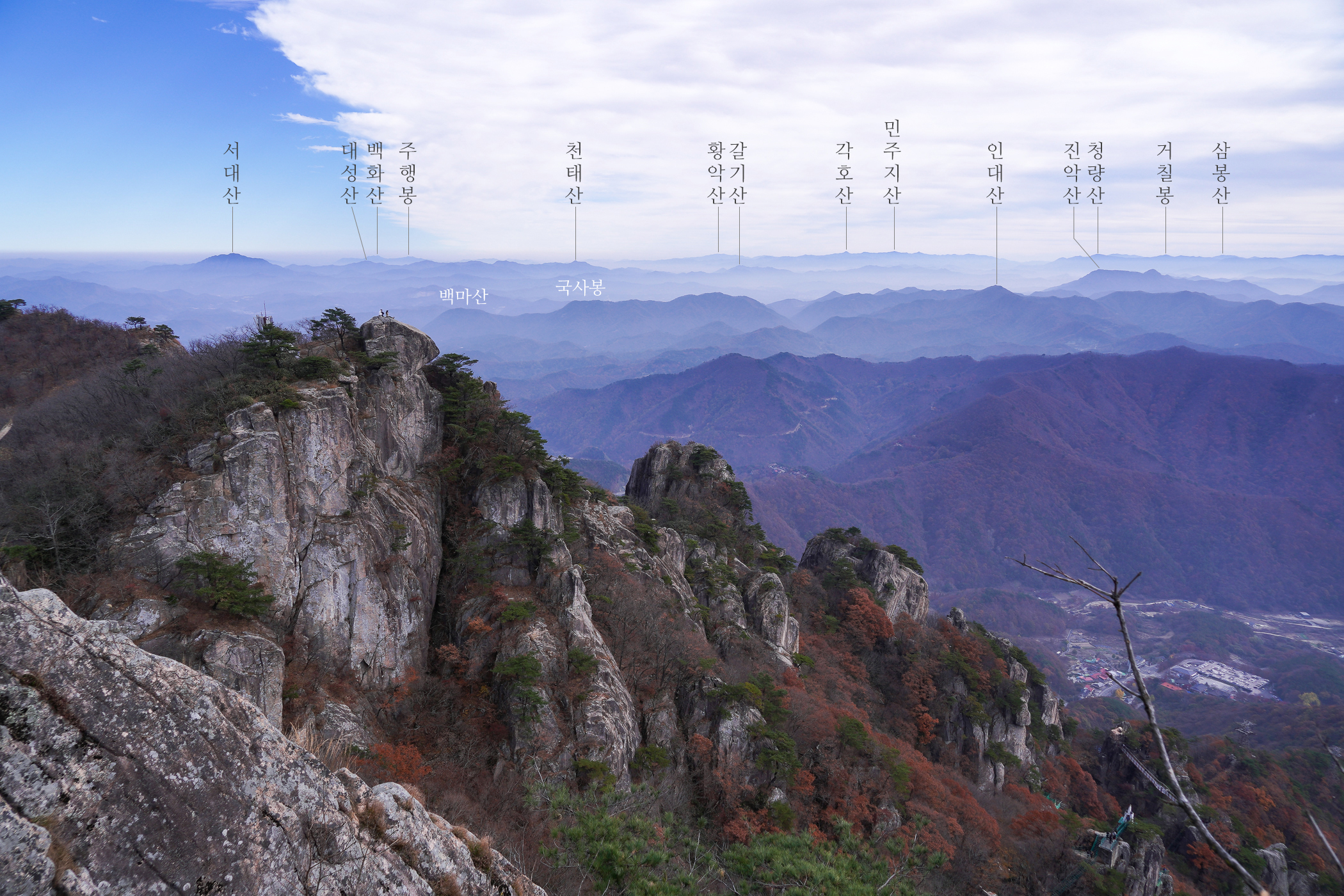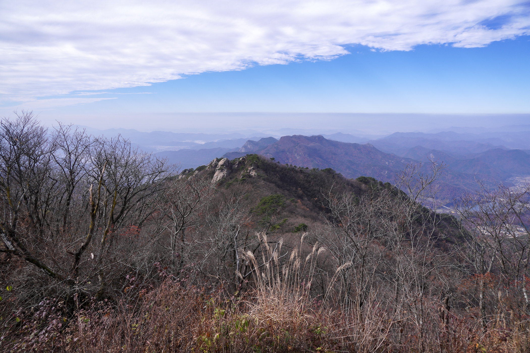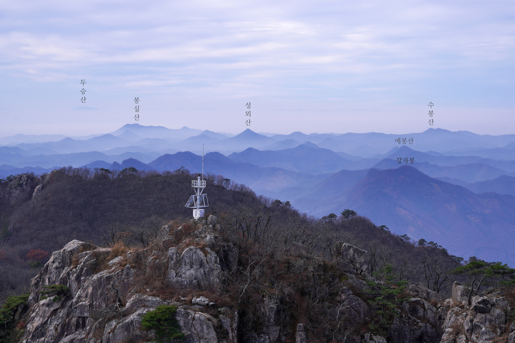 오늘 날씨는 일부 하늘이 구름에 덮여 있지만, 시야는 맑은 편이다. 360도 전망이 트인 정상에서 동북쪽부터 시계 방향으로 한 바퀴 돌며 주변 경관을 담아본다. 먼저 칠성봉 암릉이 보이는 동북쪽에 충남의 최고봉인 서대산이 보이고 그 뒤로 왼쪽에 속리산, 오른쪽에 천태산 ~ 대성산 줄기 너머로 백화산 마루가 보인다.