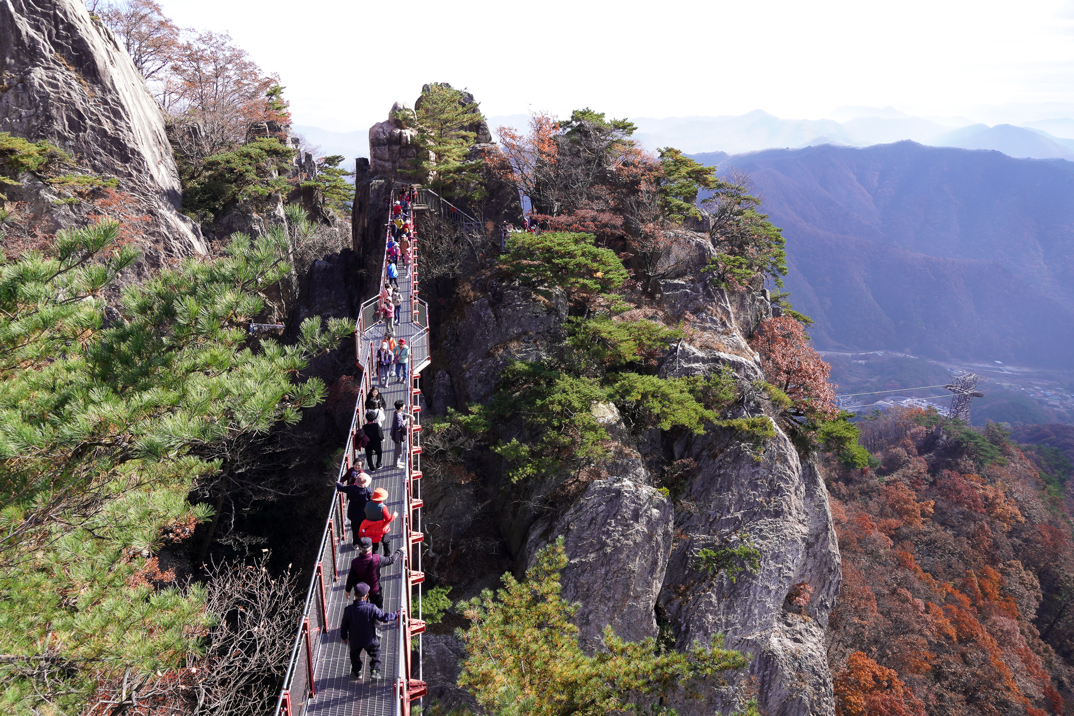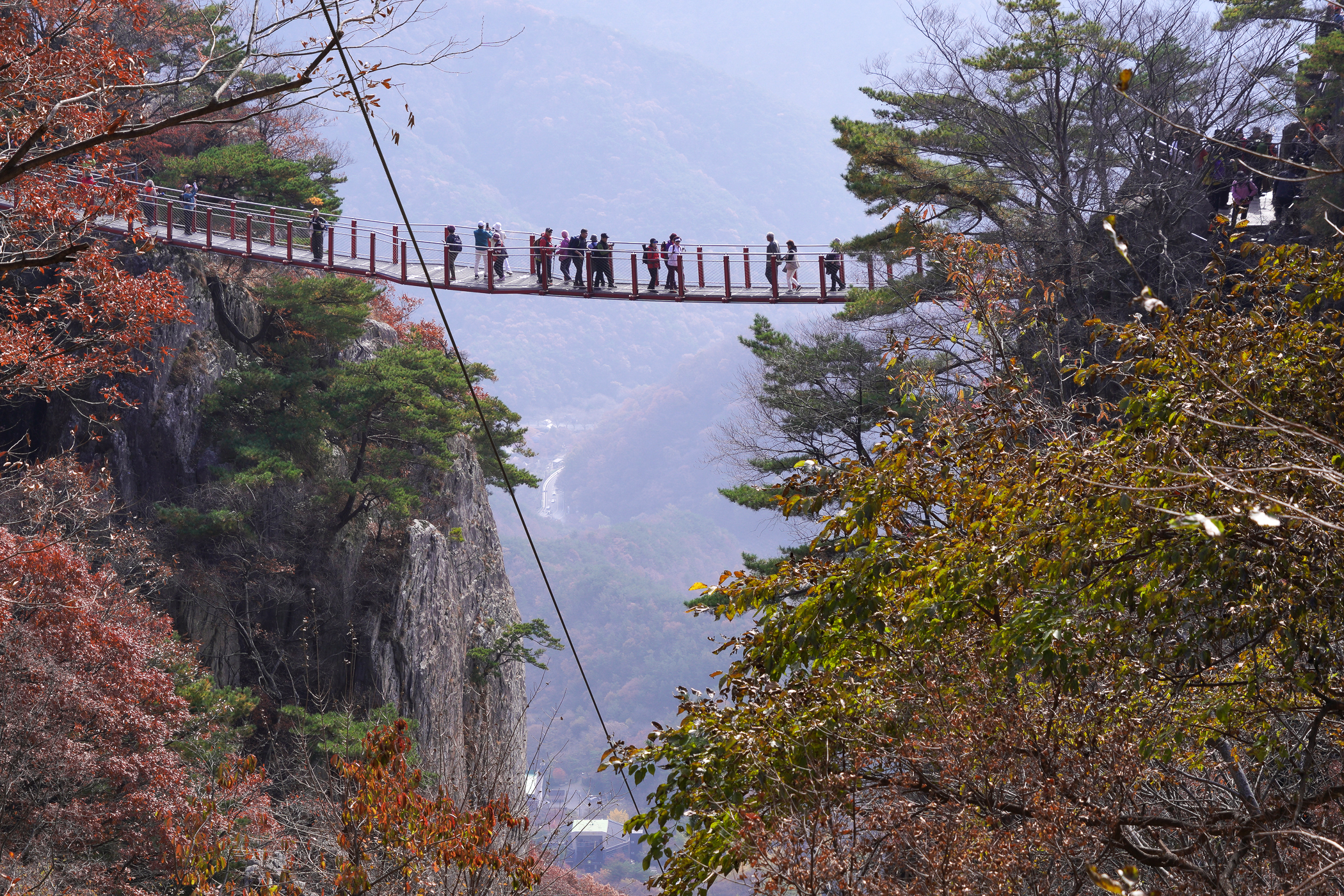 구름다리로 이어지는 길이 공사 중인지 막혀 있어 거꾸로 건너본다. 구름다리 주변은 대둔산 제일의 절경으로 기암절벽이 금강산을 방불케 한다 하여 금강계곡으로 불린다.