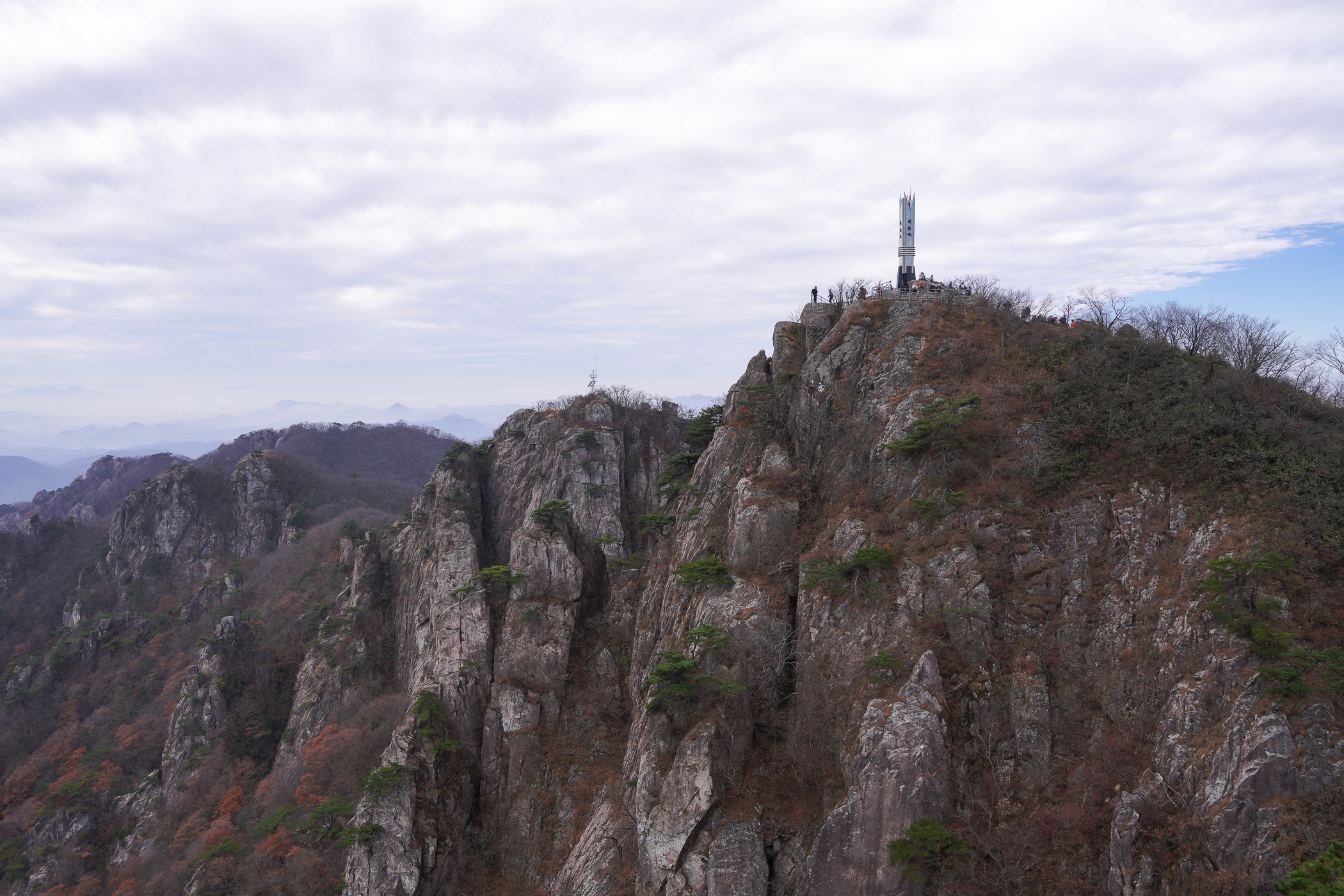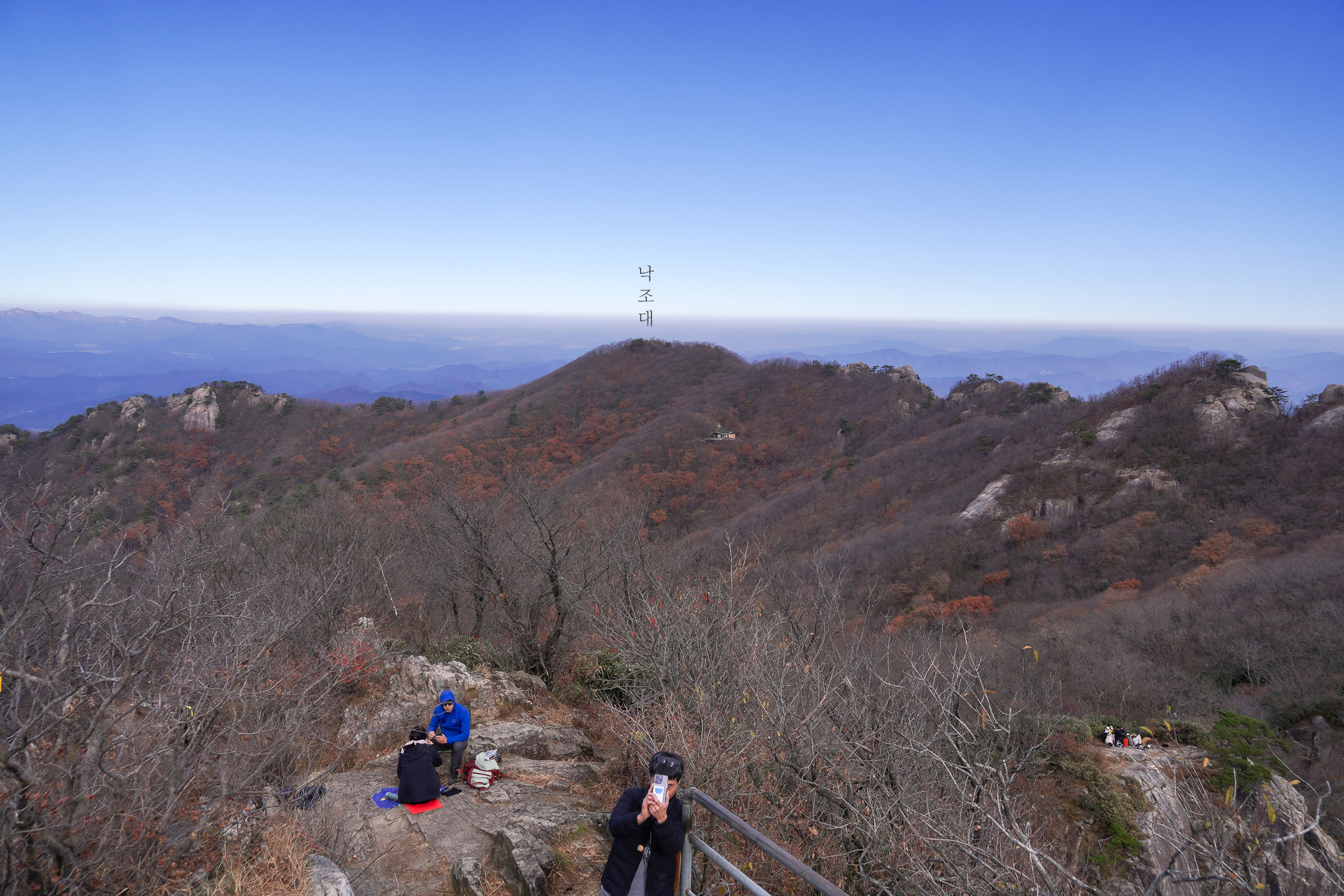 건너편 암릉 위 전망바위에서 여유롭게 휴식을 취하고 있는 사람들이 보인다. 자칫 긴장을 늦추면 위험한 상황이 될 수 있는 모습이다.
