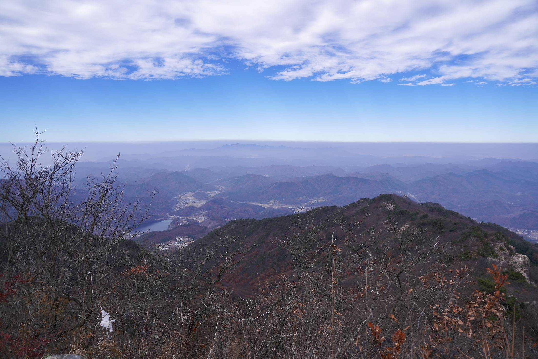 월성봉 너머 오른쪽에 계룡산이 보이는 북서쪽은 지평선 위로 짙게 띠를 두르고 있는 연무층이 원경을 가리고 있다.