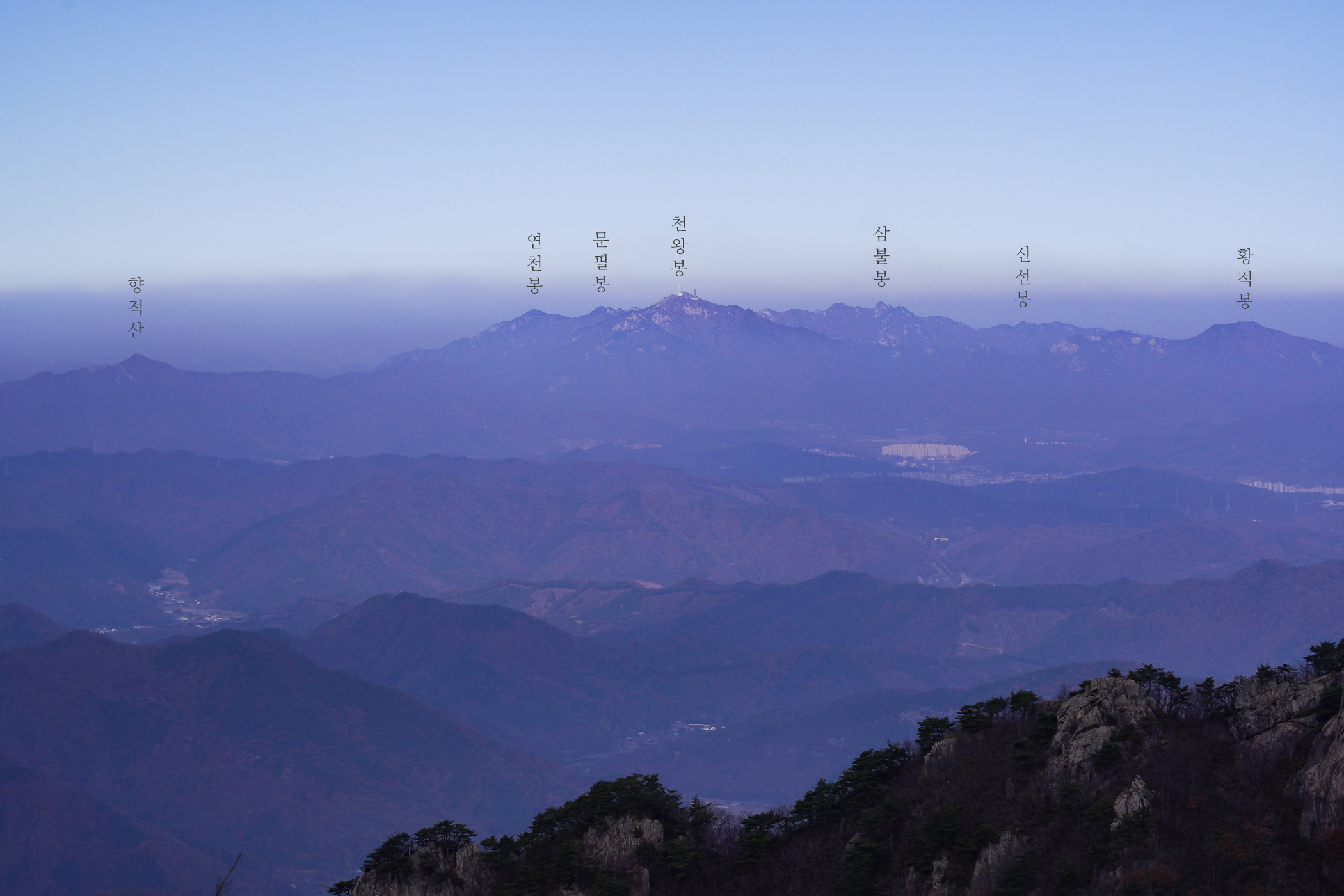 낙조대 전망은 마천대에서의 전망과 유사하다. 오후가 되면서 연무층이 짙어진 탓인지 먼 산 모습이 더 흐려져 있다.